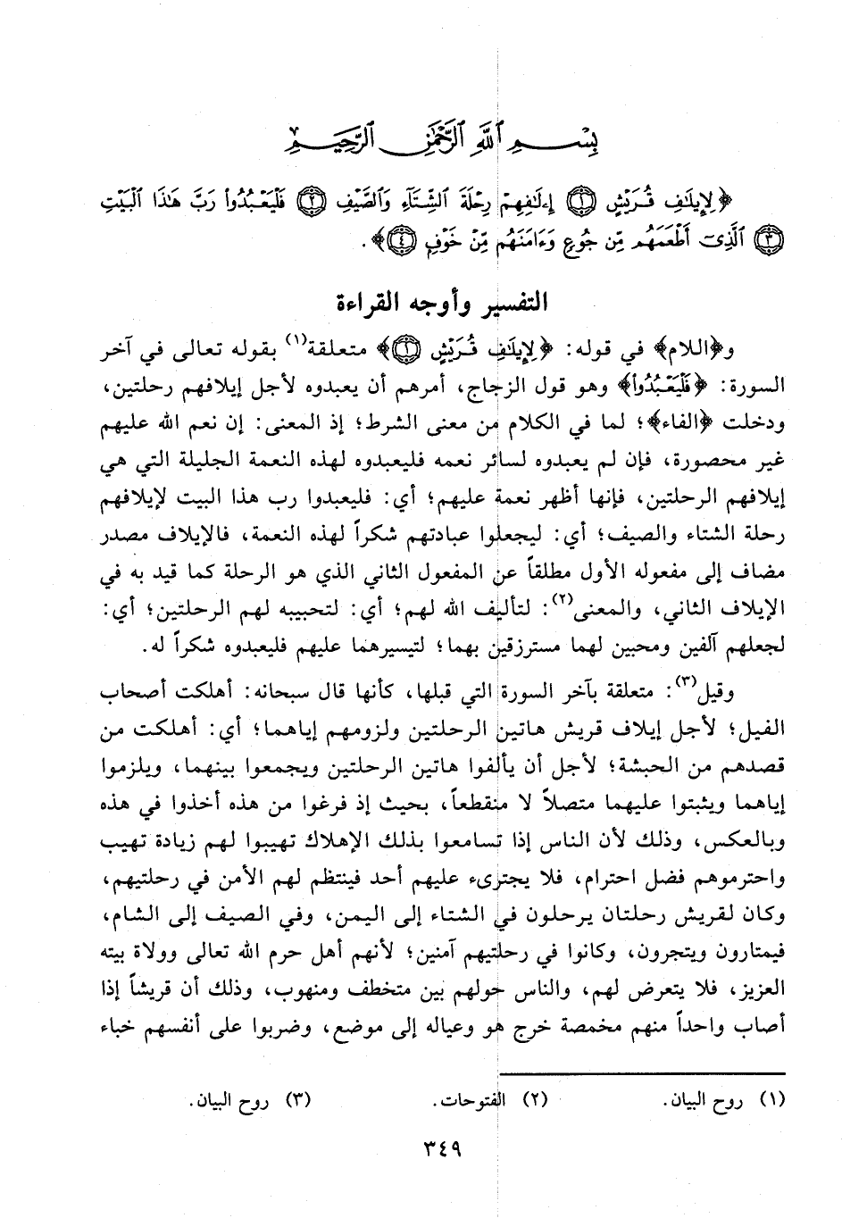 1 - و {اللام} في قوله: {لِإِيلَافِ قُرَيْشٍ (1)} متعلقة (¬1) بقوله تعالى في آخر السورة: {فَلْيَعْبُدُوا} وهو قول الزجاج، أمرهم أن يعبدوه لأجل إيلافهم رحلتين، ودخلت {الفاء}؛ لما في الكلام من معنى الشرط؛ إذ المعنى: إن نعم الله عليهم غير محصورة، فإن لم يعبدوه لسائر نعمه فليعبدوه لهذه النعمة الجليلة التي هي إيلافهم الرحلتين، فإنها أظهر نعمة عليهم؛ أي: فليعبدوا رب هذا البيت لإيلافهم رحلة الشتاء والصيف؛ أي: ليجعلوا عبادتهم شكرًا لهذه النعمة، فالإيلاف مصدر مضاف إلى مفعوله الأول مطلقًا عن المفعول الثاني الذي هو الرحلة كما قيد به في الإيلاف الثاني، والمعنى (¬2): لتأليف الله لهم؛ أي: لتحبيبه لهم الرحلتين؛ أي: لجعلهم آلفين ومحبين لهما مسترزقين بهما؛ لتيسيرهما عليهم فليعبدوه شكرًا له.