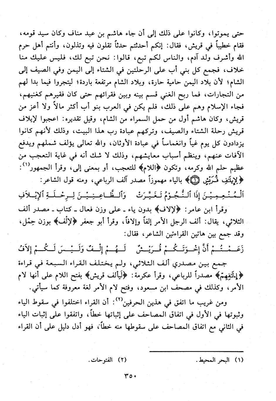 حتى يموتوا، وكانوا على ذلك إلى أن جاء هاشم بن عبد مناف وكان سيد قومه، فقام خطيبًا في قريش، فقال: إنكم أحدثتم حديثًا تقلون فيه وتذلون، وأنتم أهل حرم الله وأشرف ولد آدم، والناس لكم تبع، قالوا: نحن تبع لك، فليس عليك منا خلاف، فجمع كل بني أب على الرحلتين في الشتاء إلى اليمن وفي الصيف إلى الشام؛ لأن بلاد اليمن حامية حارة، وبلاد الشام مرتفعة باردة؛ ليتجروا فيما بدا لهم من التجارات، فما ربح الغني قسم بينه وبين فقرائهم حتى كان فقيرهم كغنيهم، فجاء الإِسلام وهم على ذلك، فلم يكن في العرب بنو أب أكثر مالًا ولا أعز من قريش، وكان هاشم أول من حمل السمراء من الشام، وقيل تقديره: اعجبوا لإيلاف قريش رحلة الشتاء والصيف، وتركهم عبادة رب هذا البيت، وذلك لأنهم كانوا يزدادون كل يوم غيًا وانغماسًا في عبادة الأوثان، والله تعالى يؤلف شملهم ويدفع الآفات عنهم، وينظم أسباب معايشهم، وذلك لا شك أنه في غاية التعجب من عظيم حلم الله وكرمه، وتكون {اللام} للتعجب، أو بمعنى إلى، وقرأ الجمهور (¬1): {لِإِيلَافِ قُرَيْشٍ (1)} بالياء مهموزًا مصدر آلف الرباعي، ومنه قول الشاعر: