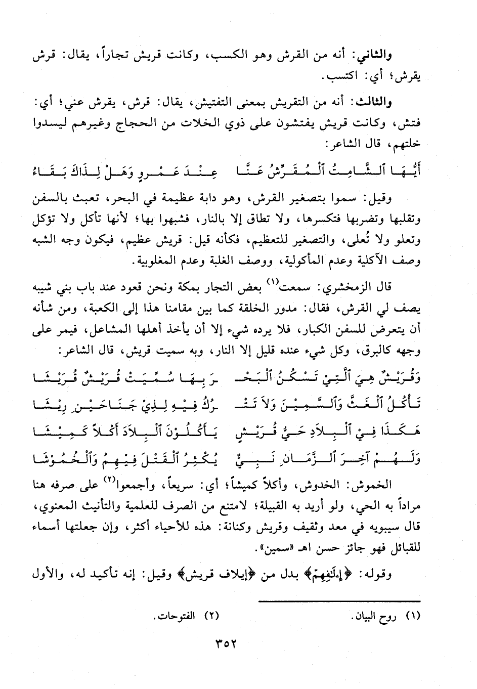 والثالث: أنه من التقريش بمعنى التفتيش، يقال: قرش، يقرش عني؛ أي: فتش، وكانت قريش يفتشون على ذوي الخلاف من الحجاج وغيرهم ليسدوا خلتهم، قال الشاعر: