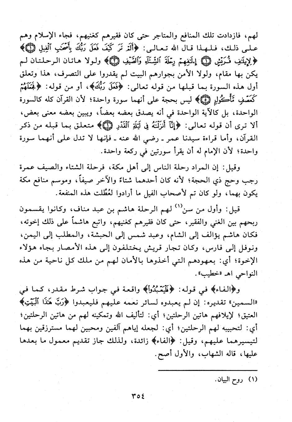 لهم، فازدادت تلك المنافع والمتاجر حتى كان فقيرهم كغنيهم، فجاء الإِسلام وهم على ذلك، فلهذا قال الله تعالى: {أَلَمْ تَرَ كَيْفَ فَعَلَ رَبُّكَ بِأَصْحَابِ الْفِيلِ (1)} {لِإِيلَافِ قُرَيْشٍ (1) إِيلَافِهِمْ رِحْلَةً الشِّتَاءِ وَالصَّيْفِ (2)} ولولا هاتان الرحلتان لم يكن بها مقام، ولولا الأمن بجوارهم البيت لم يقدروا على التصرف، هذا وتعلق أول هذه السورة بما قبلها من قوله تعالى: {فَعَلَ رَبُّكَ}، أو من قوله: {فَجَعَلَهُمْ كَعَصْفٍ مَأْكُولٍ (5)} ليس بحجة على أنهما سورة واحدة؛ لأن القرآن كله كالسورة الواحدة، بل كالآية الواحدة في أنه يصدق بعضه بعضًا، ويبين بعضه معنى بعض، ألا ترى أن قوله تعالى: {إِنَّا أَنْزَلْنَاهُ فِي لَيْلَةِ الْقَدْرِ (1)} متعلق بما قبله من ذكر القرآن، وأما قراءة سيدنا عمر - رضي الله عنه - فإنها لا تدل على أنهما سورة واحدة؛ لأن الإِمام له أن يقرأ سورتين في ركعة واحدة.