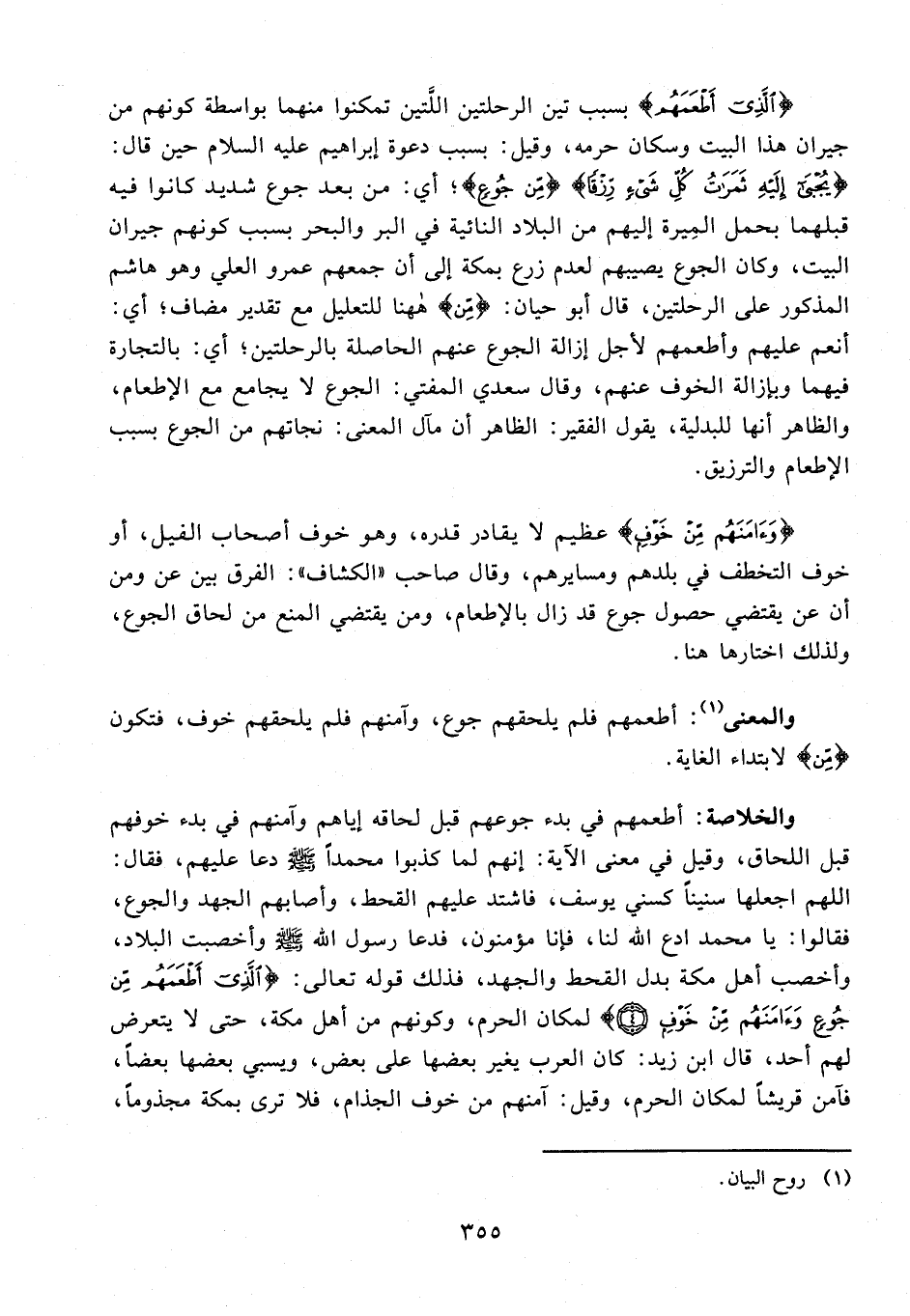 4 - {الَّذِي أَطْعَمَهُمْ} بسبب تين الرحلتين اللَّتين تمكنوا منهما بواسطة كونهم من جيران هذا البيت وسكان حرمه، وقيل: بسبب دعوة إبراهيم عليه السلام حين قال: {يُجْبَى إِلَيْهِ ثَمَرَاتُ كُلِّ شَيْءٍ رِزْقًا} {مِنْ جُوعٍ}؛ أي: من بعد جوع شديد كانوا فيه قبلهما بحمل المِيرة إليهم من البلاد النائية في البر والبحر بسبب كونهم جيران البيت، وكان الجوع يصيبهم لعدم زرع بمكة إلى أن جمعهم عمرو العلي وهو هاشم المذكور على الرحلتين، قال أبو حيان: {من} هاهنا للتعليل مع تقدير مضاف؛ أي: أنعم عليهم وأطعمهم لأجل إزالة الجوع عنهم الحاصلة بالرحلتين؛ أي: بالتجارة فيهما وبازالة الخوف عنهم، وقال سعدي المفتي: الجوع لا يجامع مع الإطعام، والظاهر أنها للبدلية، يقول الفقير: الظاهر أن مآل المعنى: نجاتهم من الجوع بسبب الإطعام والترزيق.