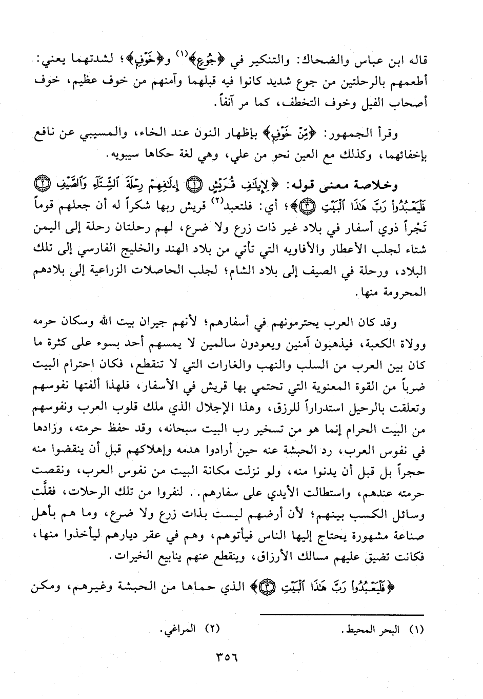 وخلاصة معنى قوله: {لِإِيلَافِ قُرَيْشٍ (1) إِيلَافِهِمْ رِحْلَةَ الشِّتَاءِ وَالصَّيْفِ (2) فَلْيَعْبُدُوا رَبَّ هَذَا الْبَيْتِ (3)}؛ أي: فلتعبد (¬2) قريش ربها شكرًا له أن جعلهم قومًا تَجْرًا ذوي أسفار في بلاد غير ذات زرع ولا ضرع، لهم رحلتان رحلة إلى اليمن شتاء لجلب الأعطار والأفاويه التي تأتي من بلاد الهند والخليج الفارسي إلى تلك البلاد، ورحلة في الصيف إلى بلاد الشام؛ لجلب الحاصلات الزراعية إلى بلادهم المحرومة منها.