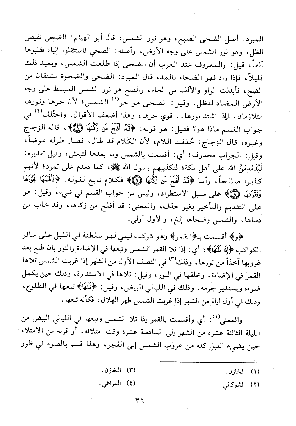 المبرد: أصل الضحى الصبح، وهو نور الشمس، قال أبو الهيثم: الضحى نقيض الظل، وهو نور الشمس على وجه الأرض، وأصله: الضحي فاستثقلوا الياء فقلبوها ألفًا، قيل: والمعروف عند العرب أن الضحى إذا طلعت الشمس، وبعيد ذلك قليلًا، فإذا زاد فهو الضحاء بالمد، قال المبرد: الضحى والضحوة مشتقان من الضح، فأبدلت الواو والألف من الحاء، والضح هو نور الشمس المنبسط على وجه الأرض المضاد للظل، وقيل: الضحى هو حر (¬1) الشمس؛ لأن حرها ونورها متلازمان، فإذا اشتد نورها .. قوي حرها، وهذا أضعف الأقوال، واختُلف (¬2) في جواب القسم ماذا هو؟ فقيل: هو قوله: {قَدْ أَفْلَحَ مَنْ زَكَّاهَا (9)}، قاله الزجاج وغيره، قال الزجاج: حُذفت اللام؛ لأن الكلام قد طال، فصار طوله عوضًا، وقيل: الجواب محذوف؛ أي: أقسمت بالشمس وما بعدها لتبعثن، وقيل تقديره: لَيُدَمْدِمَنَّ الله على أهل مكة؛ لتكذيبهم رسول الله - صلى الله عليه وسلم -، كما دمدم على ثمود؛ لأنهم كذبوا صالحًا، وأما {قَدْ أَفْلَحَ مَنْ زَكَّاهَا (9)} فكلام تابع لقوله: {فَأَلْهَمَهَا فُجُورَهَا وَتَقْوَاهَا (8)} على سبيل الاستطراد، وليس من جواب القسم في شيء، وقيل: هو على التقديم والتأخير بغير حذف، والمعنى: قد أفلح من زكاها، وقد خاب من دساها، والشمس وضحاها إلخ، والأول أولى.