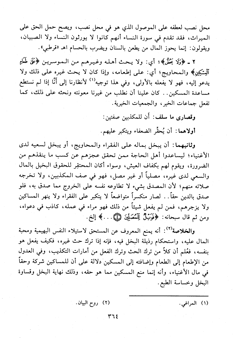 وثانيهما: أن يبخل بماله على الفقراء والمحاويج، أو يبخل لسعيه لدى الأغنياء؛ ليساعدوا أهل الحاجة ممن تحقق عجزهم عن كسب ما ينقذهم من الضرورة، ويقوم لهم بكفاف العيش، وسواء أكان المحتقِر للحقوق البخيل بالمال والسعي لدى غيره، مصليًا أو غير مصل، فهو في صف المكذبين، ولا تخرجه صلاته منهم؛ لأن المصدق بشيء لا تطاوعه نفسه على الخروج مما صدق به، فلو صدق بالدين حقًا .. لصار منكسرًا متواضعًا لا يتكبر على الفقراء ولا ينهر المساكين ولا يزجرهم، فمن لم يفعل شيئًا من ذلك فهو مراء في عمله، كاذب في دعواه، ومن ثم قال سبحانه: {فَوَيْلٌ لِلْمُصَلِّينَ (4) ...} إلخ.