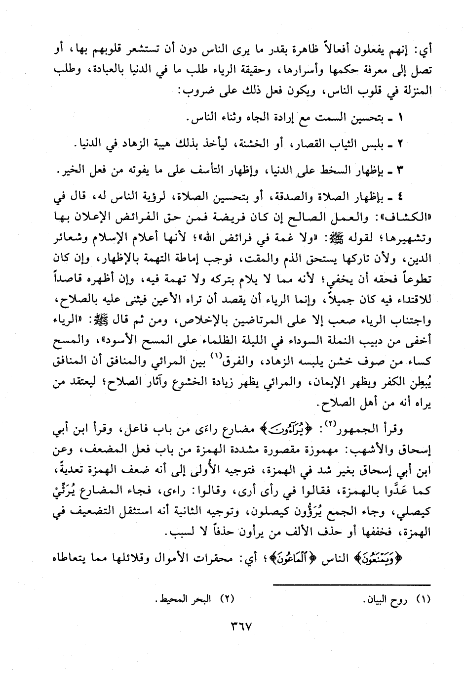 وقرأ الجمهور (¬2): {يُرَاءُونَ} مضارع راءَى من باب فاعل، وقرأ ابن أبي إسحاق والأشهب: مهموزة مقصورة مشددة الهمزة من باب فعل المضعف، وعن ابن أبي إسحاق بغير شد في الهمزة، فتوجيه الأولى، إلى أنه ضعف الهمزة تعديةً، كما عَدَّوا بالهمزة، فقالوا في رأى أرى، وقالوا: راءى، فجاء المضارع يُرَئِّيْ كيصلي، وجاء الجمع يُرَؤُّون كيصلون، وتوجيه الثانية أنه استثقل التضعيف في الهمزة، فخففها أو حذف الألف من يرأون حذفًا لا لسبب.