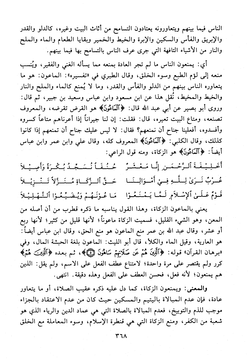 يعني بالماعون الزكاة، وهذا القول يناسبه ما ذكره قطرب من أن أصله من المعن، وهو الشيء القليل، فسميت الزكاة ماعونًا؛ لأنها قليل من كثير؛ لأنها ربع أو عشر، وقال عبد الله بن عمر منع الماعون هو منع الحق، وقال ابن عباس أيضًا: هو العارية، وقيل الماء والكلأ، قال أبو الليث: الماعون بلغة الحبشة المال، وفي "برهان القرآن" قوله: {الَّذِينَ هُمْ عَنْ صَلَاتِهِمْ سَاهُونَ (5)}، ثم بعده {الَّذِينَ هُمْ} كرر ولم يقتصر على مرة واحدة؛ لامتناع عطف الفعل على الاسم، ولم يقل: الذين هم يمنعون؛ لأنه فعل، فحسن العطف على الفعل وهذه دقيقة. انتهى.