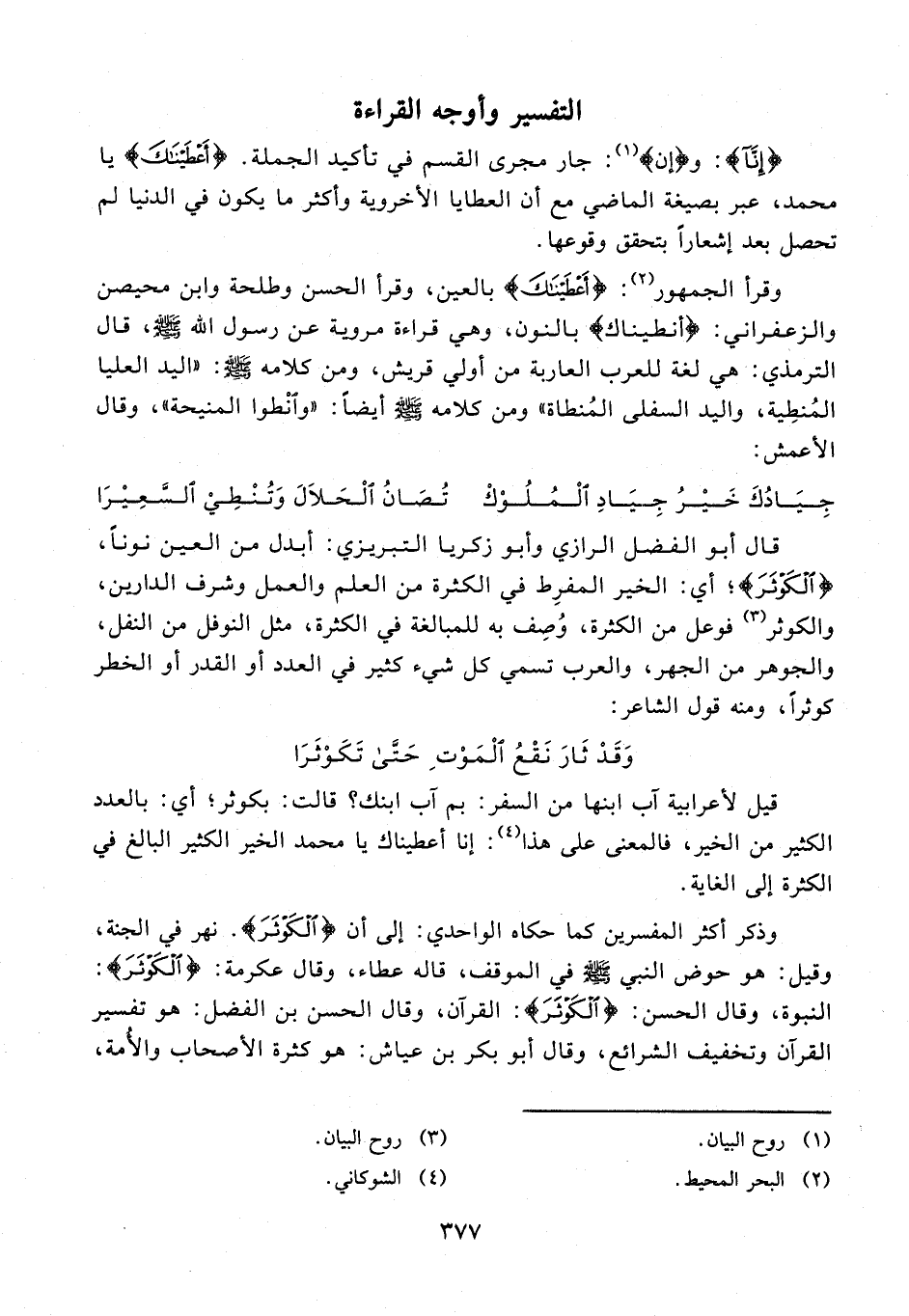 1 - {إِنَّا}: و {إن} (¬1): جار مجرى القسم في تأكيد الجملة. {أَعْطَيْنَاكَ} يا محمد، عبر بصيغة الماضي مع أن العطايا الأخروية وأكثر ما يكون في الدنيا لم تحصل بعد إشعارًا بتحقق وقوعها.