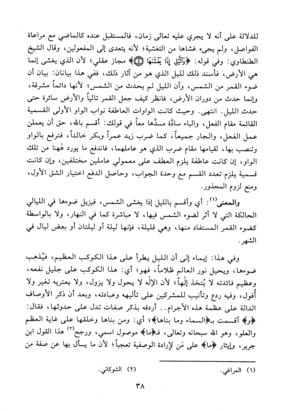 للدلالة على أنه لا يجري عليه تعالى زمان، فالمستقبل عنده كالماضي مع مراعاة الفواصل، ولم يجىء غشاها من التغشية؛ لأنه يتعدى إلى المفعولين، وقال الشيخ الطنطاوي: وفي قوله: {وَاللَّيْلِ إِذَا يَغْشَاهَا (4)} مجاز عقلي؛ لأن الذي يغشى إنما هي الأرض، فأسند ذلك لليل الذي هو من آثار ذلك، ففي هذا بيانان: بيان أن ضوء القمر من الشمس، وأن الليل لم يحدث من الشمس؛ لأنها دائمًا مشرقة، وإنما حدث من دوران الأرض، فانظر كيف جعل القمر تاليًا والأرض سائرة حتى حدث الليل. انتهى. وحيث كانت الواوات العاطفة نواب الواو الأولى القسمية القائمة مقام الفعل، والباء سادَّة مسدَّها معًا في قولك: أقسم بالله، حق أن يعملن عمل الفعل، والجار جميعًا، كما ضرب زيد عمرًا وبكر خالدًا، فترفع بالواو وتنصب بها، لقيامها مقام ضرب الذي هو عاملهما، فاندفع ما يورد هاهنا من تلك الواو، إن كانت عاطفة يلزم العطف على معمولي عاملين مختلفين، وإن كانت قسمية يلزم تعدد القسم مع وحدة الجواب، وحاصل الدفع اختيار الشق الأول، ومنع لزوم المحذور.