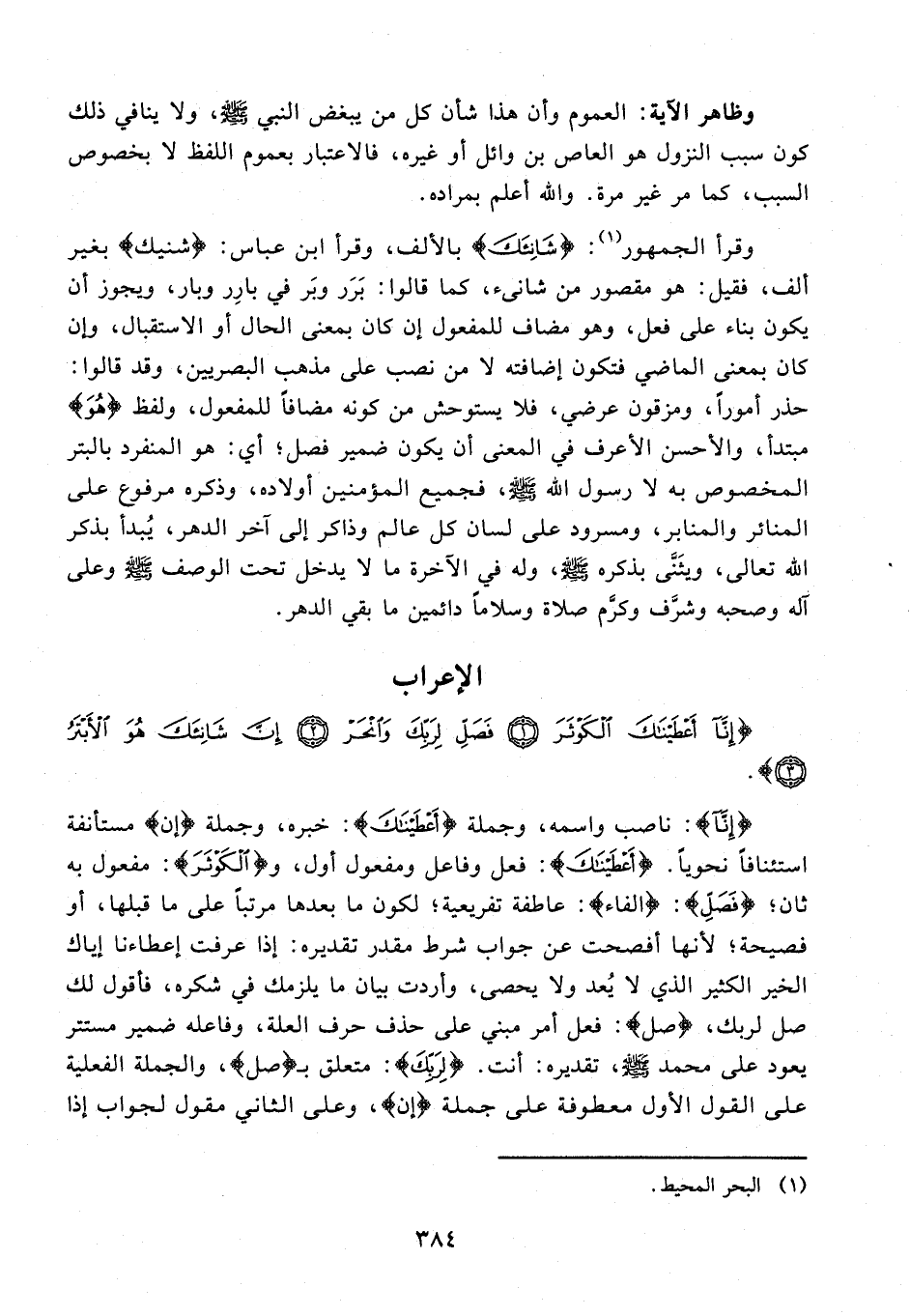 وقرأ الجمهور (¬1): {شَانِئَكَ} بالألف، وقرأ ابن عباس: {شنيك} بغير ألف، فقيل: هو مقصور من شانىء، كما قالوا: بَرَر وبَر في بارِر وبار، ويجوز أن يكون بناء على فعل، وهو مضاف للمفعول إن كان بمعنى الحال أو الاستقبال، وإن كان بمعنى الماضي فتكون إضافته لا من نصب على مذهب البصريين، وقد قالوا: حذر أمورًا، ومزقون عرضي، فلا يستوحش من كونه مضافًا للمفعول، ولفظ {هُوَ} مبتدأ، والأحسن الأعرف في المعنى أن يكون ضمير فصل؛ أي: هو المنفرد بالبتر المخصوص به لا رسول الله - صلى الله عليه وسلم -، فجميع المؤمنين أولاده، وذكره مرفوع على المنائر والمنابر، ومسرود على لسان كل عالم وذاكر إلى آخر الدهر، يُبدأ بذكر الله تعالى، ويثَنَّى بذكره - صلى الله عليه وسلم -، وله في الآخرة ما لا يدخل تحت الوصف - صلى الله عليه وسلم - وعلى آله وصحبه وشرَّف وكرَّم صلاة وسلامًا دائمين ما بقي الدهر.