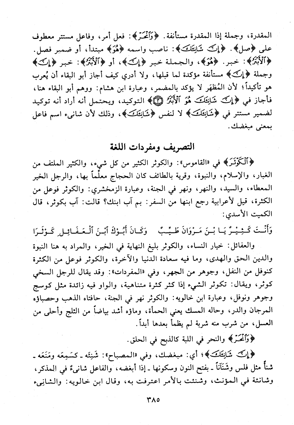 المقدرة، وجملة إذا المقدرة مستأنفة. {وَانْحَرْ}: فعل أمر، وفاعل مستتر معطوف على {صل}. {إِنَّ شَانِئَكَ}: ناصب واسمه {هُوَ} مبتدأ، أو ضمير فصل. {الْأَبْتَرُ}: خبر. {هُوَ}، والجملة خبر {إِنَّ}، أو {الْأَبْتَرُ}: خبر {إِنَّ} وجملة {إِنَّ} مستأنفة مؤكدة لما قبلها، ولا أدري كيف أجاز أبو البقاء أن يُعرب هو تأكيدًا؛ لأن المُظهَر لا يؤكد بالمضمر، وعبارة ابن هشام: ووهم أبو البقاء هنا، فأجاز في {إِنَّ شَانِئَكَ هُوَ الْأَبْتَرُ (3)} التوكيد، ويحتمل أنه أراد أنه توكيد لضمير مستتر في {شَانِئَكَ} لا لنفس {شَانِئَكَ}، وذلك لأن شانىء اسم فاعل بمعنى مبغضك.