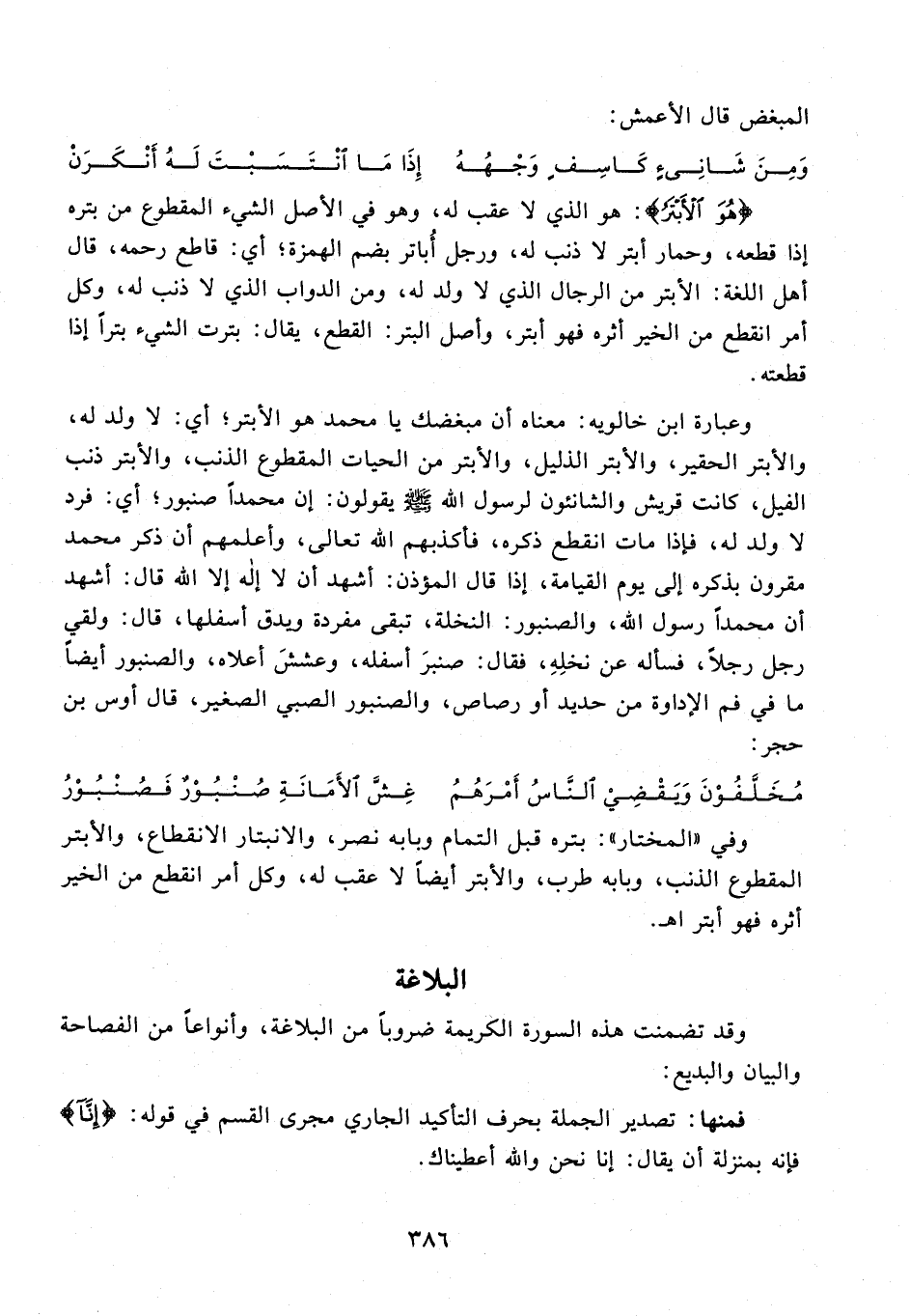 وعبارة ابن خالويه: معناه أن مبغضك يا محمد هو الأبتر؛ أي: لا ولد له، والأبتر الحقير، والأبتر الذليل، والأبتر من الحيات المقطوع الذنب، والأبتر ذنب الفيل، كانت قريش والشانئون لرسول الله - صلى الله عليه وسلم - يقولون: إن محمدًا صنبور؛ أي: فرد لا ولد له، فإذا مات انقطع ذكره، فأكذبهم الله تعالى، وأعلمهم أن ذكر محمد مقرون بذكره إلى يوم القيامة، إذا قال المؤذن: أشهد أن لا إله إلا الله قال: أشهد أن محمدًا رسول الله، والصنبور: النخلة، تبقى مفردة ويدق أسفلها، قال: ولقي رجل رجلًا، فسأله عن نخلِهِ، فقال: صنبرَ أسفله، وعششَ أعلاه، والصنبور أيضًا ما في فم الإداوة من حديد أو رصاص، والصنبور الصبي الصغير، قال أوس بن حجر: