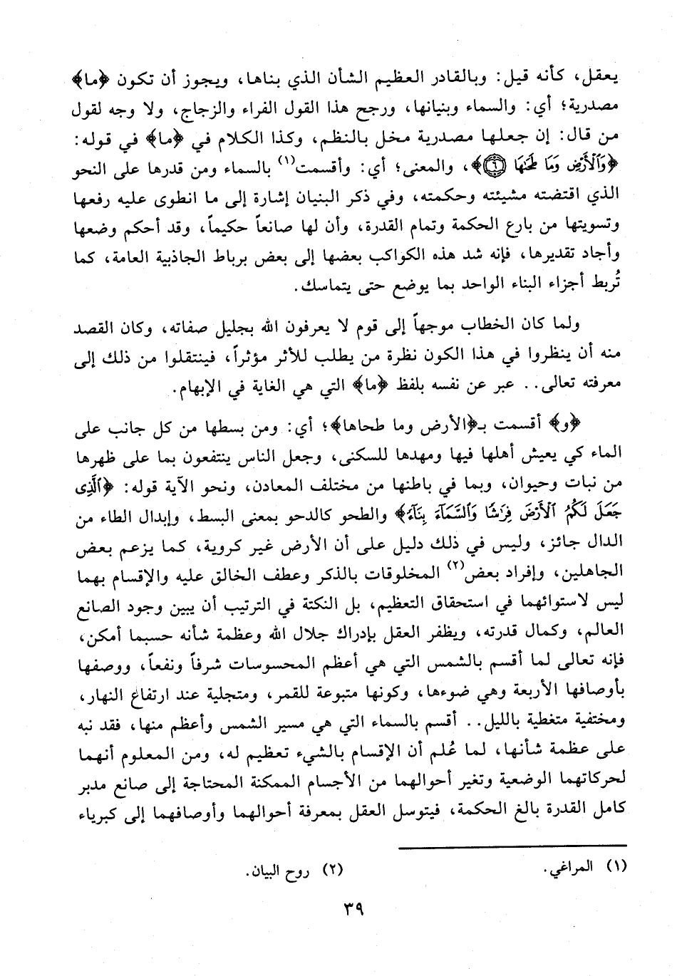 يعقل، كأنه قيل: وبالقادر العظيم الشأن الذي بناها، ويجوز أن تكون {ما} مصدرية؛ أي: والسماء وبنيانها، ورجح هذا القول الفراء والزجاج، ولا وجه لقول من قال: إن جعلها مصدرية مخل بالنظم، وكذا الكلام في {ما} في قوله: {وَالْأَرْضِ وَمَا طَحَاهَا (6)}، والمعنى؛ أي: وأقسمت (¬1) بالسماء ومن قدرها على النحو الذي اقتضته مشيئته وحكمته، وفي ذكر البنيان إشارة إلى ما انطوى عليه رفعها وتسويتها من بارع الحكمة وتمام القدرة، وأن لها صانعًا حكيمًا، وقد أحكم وضعها وأجاد تقديرها، فإنه شد هذه الكواكب بعضها إلى بعض برباط الجاذبية العامة، كما تُربط أجزاء البناء الواحد بما يوضع حتى يتماسك.