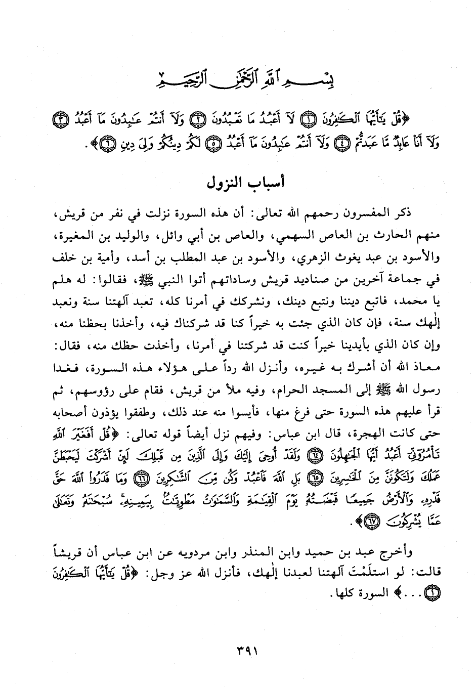 {قُلْ يَا أَيُّهَا الْكَافِرُونَ (1) لَا أَعْبُدُ مَا تَعْبُدُونَ (2) وَلَا أَنْتُمْ عَابِدُونَ مَا أَعْبُدُ (3) وَلَا أَنَا عَابِدٌ مَا عَبَدْتُمْ (4) وَلَا أَنْتُمْ عَابِدُونَ مَا أَعْبُدُ (5) لَكُمْ دِينُكُمْ وَلِيَ دِينِ (6)}.