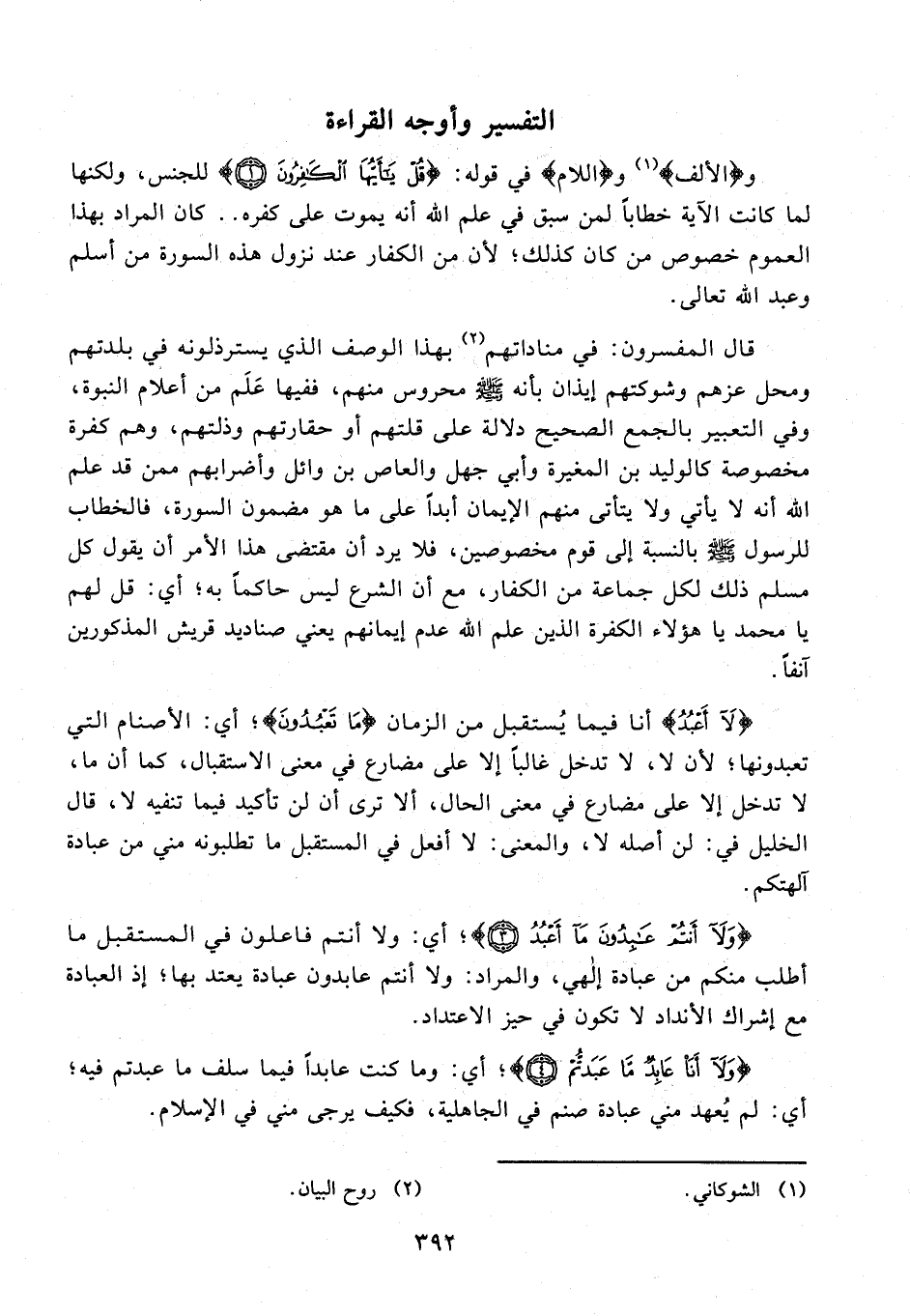 1 - و {الألف} (¬1) و {اللام} في قوله: {قُلْ يَاأَيُّهَا الْكَافِرُونَ (1)} للجنس، ولكنها لما كانت الآية خطابًا لمن سبق في علم الله أنه يموت على كفره .. كان المراد بهذا العموم خصوص من كان كذلك؛ لأن من الكفار عند نزول هذه السورة من أسلم وعبد الله تعالى.