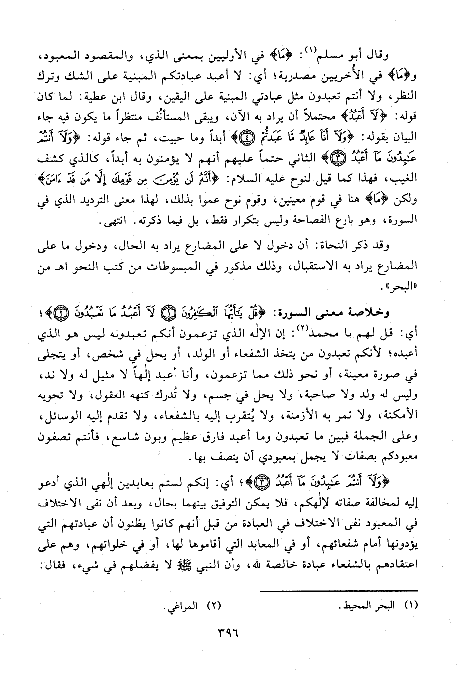 {وَلَا أَنْتُمْ عَابِدُونَ مَا أَعْبُدُ (3)}؛ أي: إنكم لستم بعابدين إلهي في أدعو إليه لمخالفة صفاته لإلهكم، فلا يمكن التوفيق بينهما بحال، وبعد أن نفى الاختلاف في المعبود نفى الاختلاف في العبادة من قبل أنهم كانوا يظنون أن عبادتهم التي يؤدونها أمام شفعائهم، أو في المعابد التي أقاموها لها، أو في خلواتهم، وهم على اعتقادهم بالشفعاء عبادة خالصة لله، وأن النبي - صلى الله عليه وسلم - لا يفضلهم في شيء، فقال: