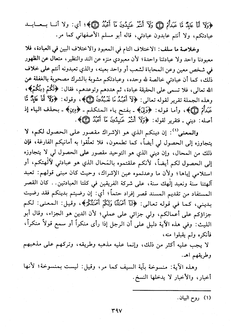 6 - ثم هددهم وتوعدهم، فقال: {لَكُمْ دِينُكُمْ}، وهذه الجملة تقرير لقوله تعالى: {لَا أَعْبُدُ مَا تَعْبُدُونَ (2)}، وقوله: {وَلَا أَنَا عَابِدٌ مَا عَبَدْتُمْ (4)}، وأما قوله: {وَلِيَ} - بفتح ياء المتكلم - {دِينِ} - بحذف الياء إذ أصله: ديني - فتقرير لقوله: {وَلَا أَنْتُمْ عَابِدُونَ مَا أَعْبُدُ (3)}.