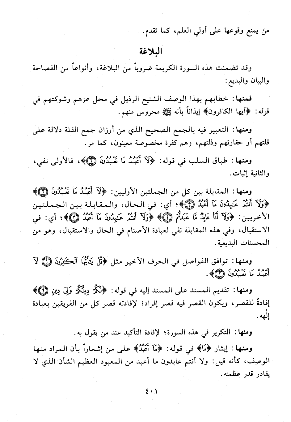 ومنها: المقابلة بين كل من الجملتين الأوليين: {لَا أَعْبُدُ مَا تَعْبُدُونَ (2)} {وَلَا أَنْتُمْ عَابِدُونَ مَا أَعْبُدُ (3)}؛ أي: في الحال، والمقابلة بين الجملتين الأخريين: {وَلَا أَنَا عَابِدٌ مَا عَبَدْتُمْ (4)} {وَلَا أَنْتُمْ عَابِدُونَ مَا أَعْبُدُ (3)}؛ أي: في الاستقبال، وفي هذه المقابلة نفي لعبادة الأصنام في الحال والاستقبال، وهو من المحسنات البديعية.