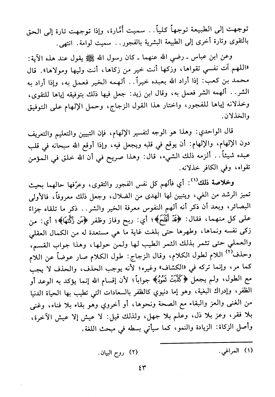 وعن ابن عباس - رضي الله عنهما - كان رسول الله - صلى الله عليه وسلم - يقول عند هذه الآية: "اللهم آت نفسي تقواها، وزكها أنت خير من زكاها، أنت وليها ومولاها". قال محمد بن كعب: إذا أراد الله بعبده خيرًا .. ألهمه الخير فعمل به، وإذا أراد به الشر .. ألهمه الشر فعمل به، وقال ابن زيد: جعل فيها ذلك بتوفيقه إياها للتقوى، وخذلانه إياها للفجور، واختار هذا القول الزجاج، وحمل الإلهام على التوفيق والخذلان.