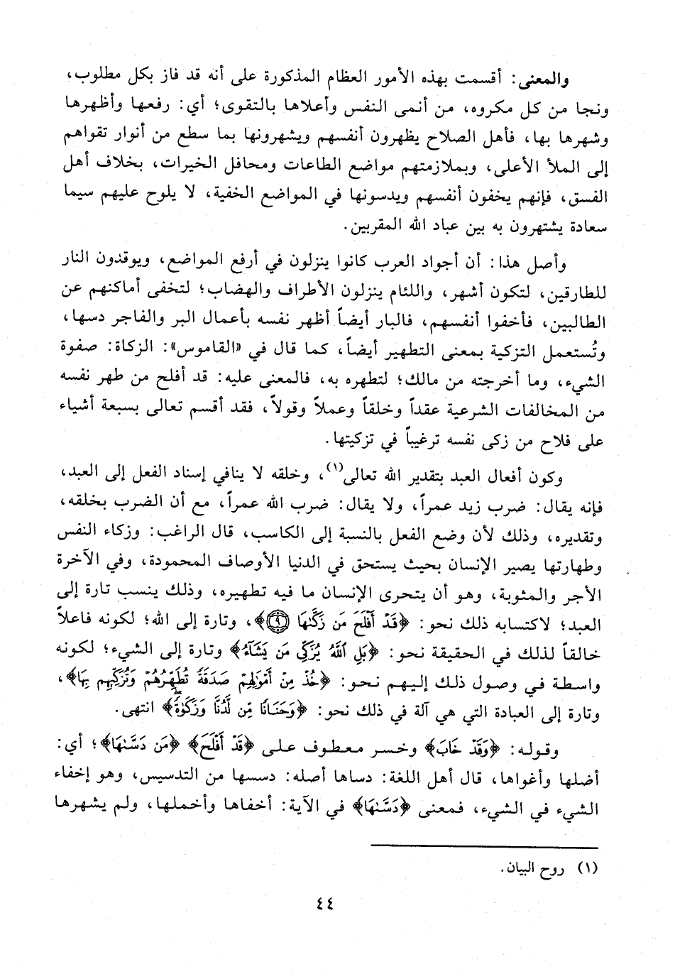 والمعنى: أقسمت بهذه الأمور العظام المذكورة على أنه قد فاز بكل مطلوب، ونجا من كل مكروه، من أنمى النفس وأعلاها بالتقوى؛ أي: رفعها وأظهرها وشهرها بها، فأهل الصلاح يظهرودن أنفسهم ويشهرونها بما سطع من أنوار تقواهم إلى الملأ الأعلى، وبملازمتهم مواضع الطاعات ومحافل الخيرات، بخلاف أهل الفسق، فإنهم يخفون أنفسهم ويدسونها في المواضع الخفية، لا يلوح عليهم سيما سعادة يشتهرودن به بين عباد الله المقربين.