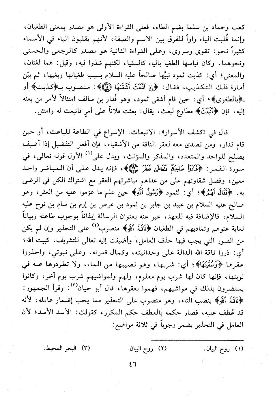 قال في "كشف الأسرار": الانبعاث: الإسراع في الطاعة للباعث، أو حين قام قدار، ومن تصدى معه لعقر الناقة من الأشقياء، فإن أفعل التفضيل إذا أضيف يصلح للواحد والمتعدد، والمذكر والمؤنث، ويدل على (¬1) الأول قوله تعالى، في سورة القمر: {فَنَادَوْا صَاحِبَهُمْ فَتَعَاطَى فَعَقَرَ (29)}، فإنه يدل على أن المباشر واحد معين، وفضل شقاوتهم على من عداهم مباشرتهم العقر مع اشتراك الكل في الرضى به.