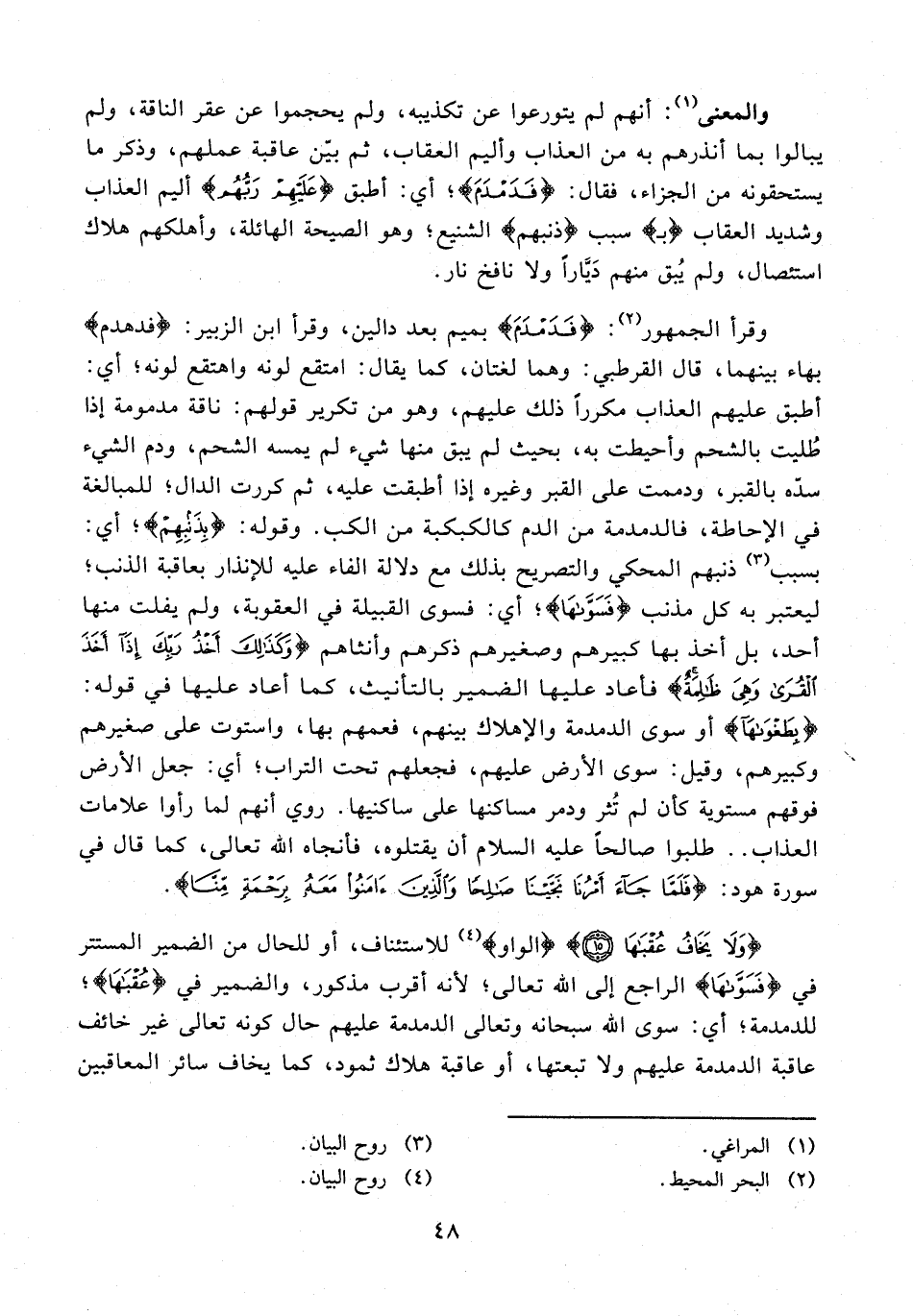وقرأ الجمهور (¬2): {فَدَمْدَمَ} بميم بعد دالين، وقرأ ابن الزبير: {فدهدم} بهاء بينهما، قال القرطبي: وهما لغتان، كما يقال: امتقع لونه واهتقع لونه؛ أي: أطبق عليهم العذاب مكررًا ذلك عليهم، وهو من تكرير قولهم: ناقة مدمومة إذا طُليت بالشحم وأحيطت به، بحيث لم يبق منها شيء لم يمسه الشحم، ودم الشيء سدّه بالقبر، ودممت على القبر وغيره إذا أطبقت عليه، ثم كررت الدال؛ للمبالغة في الإحاطة، فالدمدمة من الدم كالكبكبة من الكب. وقوله: {بِذَنْبِهِمْ}؛ أي: بسبب (¬3) ذنبهم المحكي والتصريح بذلك مع دلالة الفاء عليه للإنذار بعاقبة الذنب؛ ليعتبر به كل مذنب {فَسَوَّاهَا}؛ أي: فسوى القبيلة في العقوبة، ولم يفلت منها أحد، بل أخذ بها كبيرهم وصغيرهم ذكرهم وأنثاهم {وَكَذَلِكَ أَخْذُ رَبِّكَ إِذَا أَخَذَ الْقُرَى وَهِيَ ظَالِمَةٌ} فأعاد عليها الضمير بالتأنيث، كما أعاد عليها في قوله: {بِطَغْوَاهَا} أو سوى الدمدمة والإهلاك بينهم، فعمهم بها، واستوت على صغيرهم وكبيرهم، وقيل: سوى الأرض عليهم، فجعلهم تحت التراب؛ أي: جعل الأرض فوقهم مستوية كان لم تُثر ودمر مساكنها على ساكنيها. روي أنهم لما رأوا علامات العذاب .. طلبوا صالحًا عليه السلام أن يقتلوه، فأنجاه الله تعالى، كما قال في سورة هود: {فَلَمَّا جَاءَ أَمْرُنَا نَجَّيْنَا صَالِحًا وَالَّذِينَ آمَنُوا مَعَهُ بِرَحْمَةٍ مِنَّا}.