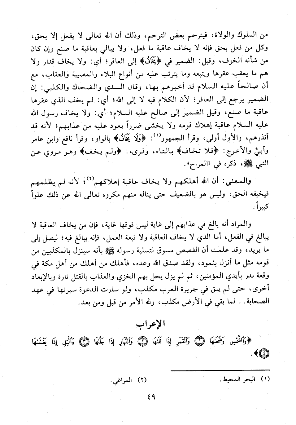 من الملوك والولاة، فيترحم بعض الترحم، وذلك أن الله تعالى لا يفعل إلا بحق، وكل من فعل بحق فإنه لا يخاف عاقبة ما فعل، ولا يبالي بعاقبة ما صنع وإن كان من شأنه الخوف، وقيل: الضمير في {يَخَافُ} إلى العاقر؛ أي: ولا يخاف قدار ولا هم ما يعقب عقرها ويتبعه وما يترتب عليه من أنواع البلاء والمصيبة والعقاب، مع أن صالحًا عليه السلام قد أخبرهم بها، وقال السدي والضحاك والكلبي: إن الضمير يرجع إلى العاقر؛ لأن الكلام فيه لا إلى الله؛ أي: لم يخف الذي عقرها عاقبة ما صنع، وقيل الضمير إلى صالح عليه السلام؛ أي: ولا يخاف رسول الله عليه السلام عاقبة إهلاك قومه ولا يخشى ضررًا يعود عليه من عذابهم؛ لأنه قد أنذرهم، والأول أولى، وقرأ الجمهور (¬1): {وَلَا يَخَافُ} بالواو، وقرأ نافع وابن عامر وأبىٌّ والأعرج: {فلا تخاف} بالتاء، وقرىء: {ولم يخف} وهو مروي عن النبي - صلى الله عليه وسلم -، ذكره في "المراح".