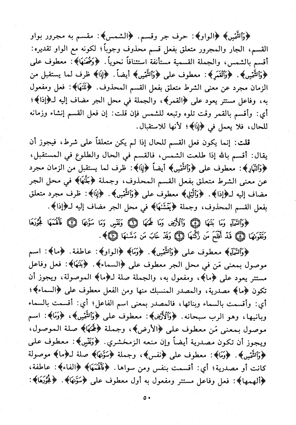 {وَالشَّمْسِ} {الواو}: حرف جر وقسم. {الشمس}: مقسم به مجرور بواو القسم، الجار والمجرور متعلق بفعل قسم محذوف وجوبًا؛ لكونه مع الواو تقديره: أقسم بالشمس، والجملة القسمية مستأنفة استئنافًا نحويًا. {وَضُحَاهَا}: معطوف على {وَالشَّمْسِ}. {وَالْقَمَرِ}: معطوف على {وَالشَّمْسِ} أيضًا. {إِذَا} ظرف لما يستقبل من الزمان مجرد عن معنى الشرط متعلق بفعل القسم المحذوف. {تَلَاهَا}: فعل ومفعول به، وفاعل مستتر يعود على {القمر}، والجملة في محل الجر مضاف إليه لـ {إذا}؛ أي: وأقسم بالقمر وقت تلوه وتبعه للشمس فإن قلت: إن فعل القسم إنشاء وزمانه للحال، فلا يعمل في {إِذَا}؛ لأنها للاستقبال.