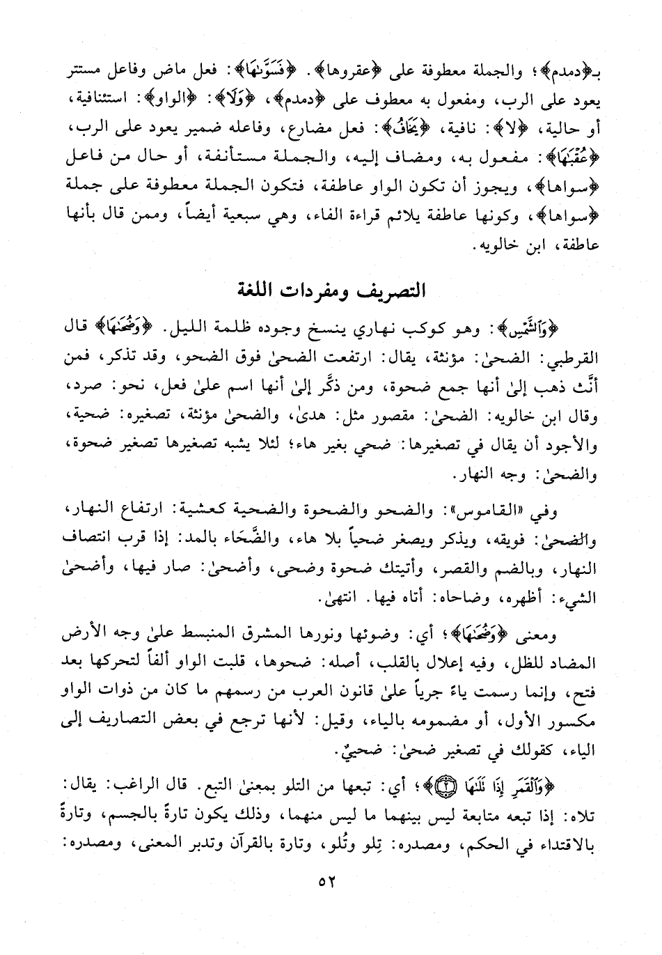 ومعنى {وَضُحَاهَا}؛ أي: وضوئها ونورها المشرق المنبسط على وجه الأرض المضاد للظل، وفيه إعلال بالقلب، أصله: ضحوها، قلبت الواو ألفًا لتحركها بعد فتح، وإنما رسمت ياءً جريًا على قانون العرب من رسمهم ما كان من ذوات الواو مكسور الأول، أو مضمومه بالياء، وقيل: لأنها ترجع في بعض التصاريف إلى الياء، كقولك في تصغير ضحى: ضحيٌ.