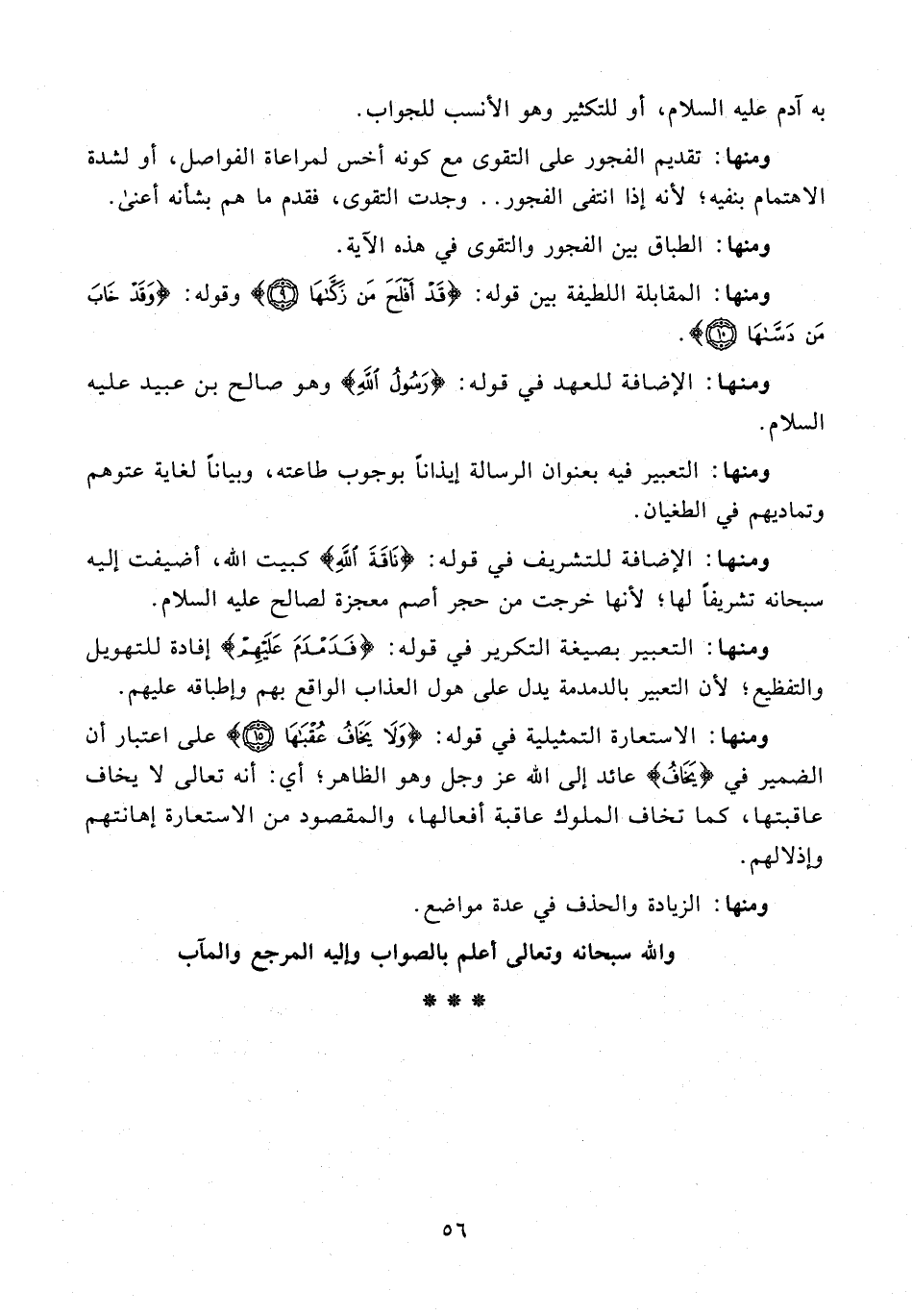 ومنها: تقديم الفجور على التقوى مع كونه أخس لمراعاة الفواصل، أو لشدة الاهتمام بنفيه؛ لأنه إذا انتفى الفجور .. وجدت التقوى، فقدم ما هم بشأنه أعنى.