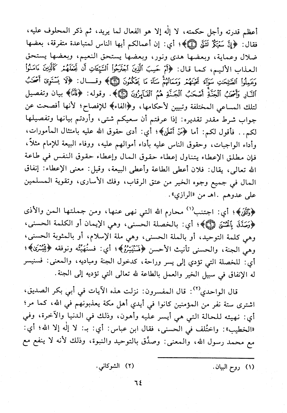 أعظم قدرته وأجل حكمته، لا إله إلا هو الفعال لما يريد، ثم ذكر المحلوف عليه، فقال: {إِنَّ سَعْيَكُمْ لَشَتَّى (4)}؛ أي: من أعمالكم أيها الناس لمتباعدة متفرقة، بعضها ضلال وعماية، وبعضها هدى ونور، وبعضها يستحق النعيم، وبعضها يستحق العذاب الأليم، كما قال: {أَمْ حَسِبَ الَّذِينَ اجْتَرَحُنا السَّيِّئَاتِ أَنْ نَجْعَلَهُمْ كَالَّذِينَ آمَنُنا نَعَمِلُنا الصَّالِحَاتِ سَنَاءً مَحْيَاهُمْ نَمَمَاتُهُمْ سَاءَ مَا يَحْكُمُننَ (21)} وقال: {لَا يَسْتَنِي أَصْحَابُ النَّارِ نَأَصْحَابُ الْجَنَّةِ أَصْحَابُ الْجَنَّةِ هُمُ الْفَائِزُننَ (20)}.