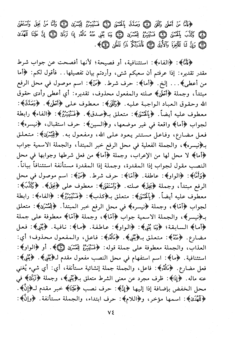 {فَأَمَّا}: {الفاء}: استئنافية، من فصيحة؛ لأنها أفصحت عن جواب شرط مقدر تقديره: إذا عرفتم أن سعيكم شتى، وأردتم بيان تفصيلها .. فأقول لكم: {أما من أعطى} ... إلخ. {أما}: حرف شرط. {مَنْ}: اسم موصول في محل الرفع مبتدأ، وجملة {أَعْطَى} صلته والمفعول محذوف، تقديره: أي أعطى وأدى حقوق الله وحقوق العباد الواجبة عليه. {وَاتَّقَى}: معطوف على {أَعْطَى}. {وَصَدَّقَ}: معطوف عليه أيضًا. {بِالْحُسْنَى}: متعلق بـ {صدق}. {فَسَنُيَسِّرُهُ}: {الفاء} رابطة لجواب {أما} واقعة في غير موضعها، و {السين}: حرف استقبال، {نيسره}: فعل مضارع، وفاعل مستتر يعود على الله، ومفعول به. {لِلْيُسْرَى}: متعلق بـ {نيسره}، والجملة الفعلية في محل الرفع خبر المبتدأ، والجملة الاسمية جواب {أما} لا محل لها من الإعراب، وجملة {أما} من فعل شرطها وجوابها في محل النصب مقول لجواب إذا المقدرة، وجملة إذا المقدرة مستأنفة استئنافًا بيانًا. {وَأَمَّا}: {الواو}: عاطفة. {أَمَّا}: حرف شرط. {مَنْ}: اسم موصول في محل الرفع مبتدأ، وجملة {بَخِلَ} صلته. {وَاسْتَغْنَى}: معطوف على {بَخِلَ}. {وَكَذَّبَ}: معطوف عليه أيضًا. {بِالْحُسْنَى}: متعلق بـ {كذب}: {فَسَنُيَسِّرُهُ}: {الفاء}: رابطة لجواب {أَمَّا}، وجملة {نيسره} في محل الرفع خبر المبتدأ. {لِلْعُسْرَى}: متعلق بـ {نيسر}، والجملة الاسمية جواب {أَمَّا}، وجملة {أَمَّا} معطوفة على جملة {أما} السابقة؛ {وَمَا يُغْنِي}: {الواو}: عاطفة. {ما}: نافية. {يُغْنِي}: فعل مضارع. {عَنْهُ}: متعلق بـ {يُغْنِي}. {مَالُهُ}: فاعل، والمفعول محذوف؛ أي: العذاب، والجملة معطوفة على جملة قوله: {فَسَنُيَسِّرُهُ لِلْعُسْرَى (10)}.أو {الواو}: استئنافية. {ما}: اسم استفهام في محل النصب مفعول مقدم لـ {يُغْنِي}. {يُغْنِي}: فعل مضارع. {مَالُهُ}: فاعل، والجملة جملة إنشائية مستأنفة، أي: أي شيء يُغني عنه ماله. {إِذَا}: ظرف مجرد عن معنى الشرط متعلق بـ {يُغْنِي}، وجملة {تَرَدَّى} في محل الخفض بإضافة إذا إليها {إِنَّ}: حرف نصب {عَلَيْنَا} خبر مقدم لـ {إِنَّ}. {لَلْهُدَى}: اسمها مؤخر، و {اللام}: حرف ابتداء، والجملة مستأنفة. {وَإِنَّ}: