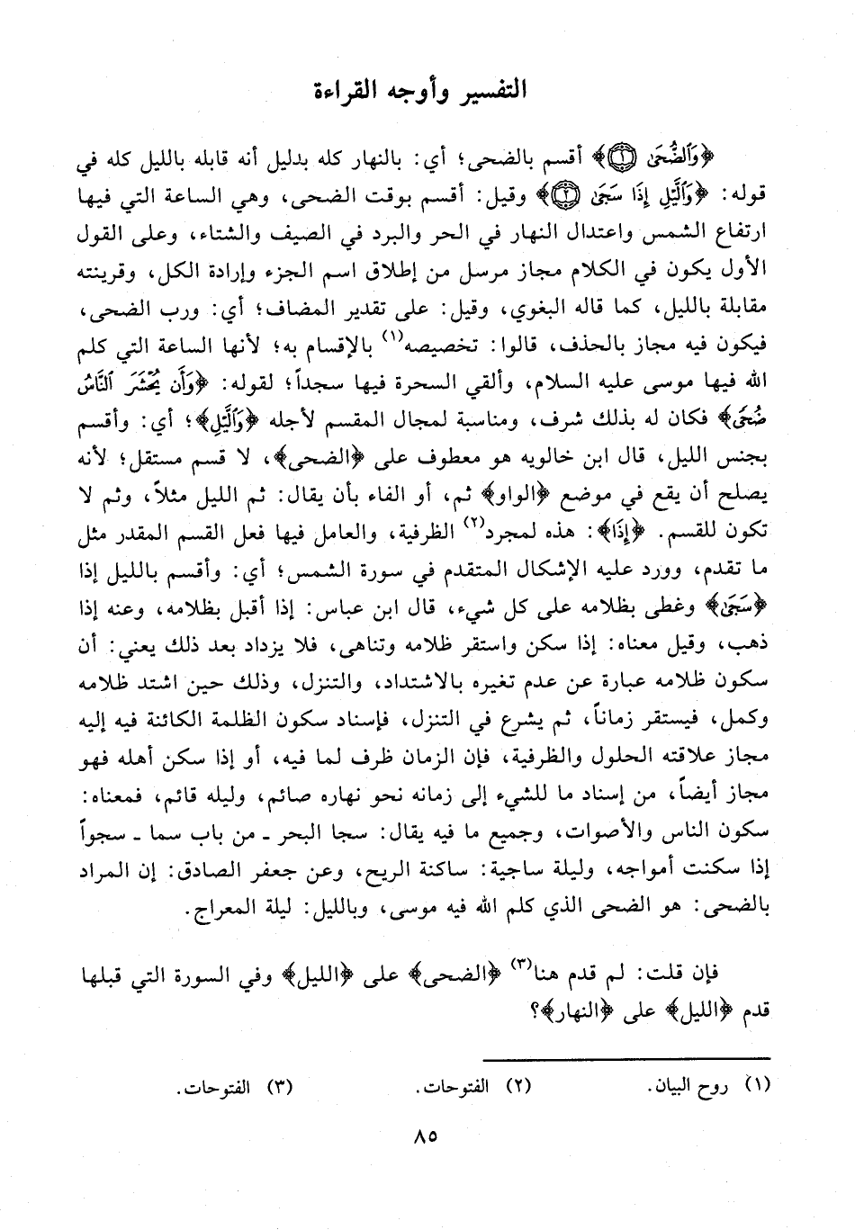 1 - {وَالضُّحَى (1)} أقسم بالضحى؛ أي: بالنهار كله بدليل أنه قابله بالليل كله في قوله: {وَاللَّيْلِ إِذَا سَجَى (2)} وقيل: أقسم بوقت الضحى، وهي الساعة التي فيها ارتفاع الشمس واعتدال النهار في الحر والبرد في الصيف والشتاء، وعلى القول الأول يكون في الكلام مجاز مرسل من إطلاق اسم الجزء وإرادة الكل، وقرينته مقابلة بالليل، كما قاله البغوي، وقيل: على تقدير المضاف؛ أي: ورب الضحى، فيكون فيه مجاز بالحذف، قالوا: تخصيصه (¬1) بالإقسام به؛ لأنها الساعة التي كلم الله فيها موسى عليه السلام، وألقي السحرة فيها سجدًا؛ لقوله: {وَأَنْ يُحْشَرَ النَّاسُ ضُحًى} فكان له بذلك شرف، ومناسبة لمجال المقسم لأجله