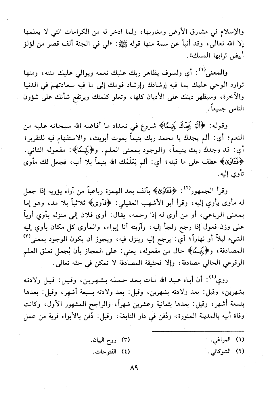 6 - وقوله: {أَلَمْ يَجِدْكَ يَتِيمًا} شروع في تعداد ما أفاضه الله سبحانه عليه من النعم؛ أي: ألم يجدك يا محمد ربك يتيمًا بموت أبويك، والاستفهام فيه للتقرير؛ أي: قد وجدك ربك يتيمًا، والوجود بمعنى العلم. و {يَتِيمًا}: مفعوله الثاني. {فَآوَى} عطف على ما قبله؛ أي: ألم يَعْلَمْك الله يتيمًا بلا أب، فجعل لك مأوى تأوي إليه.