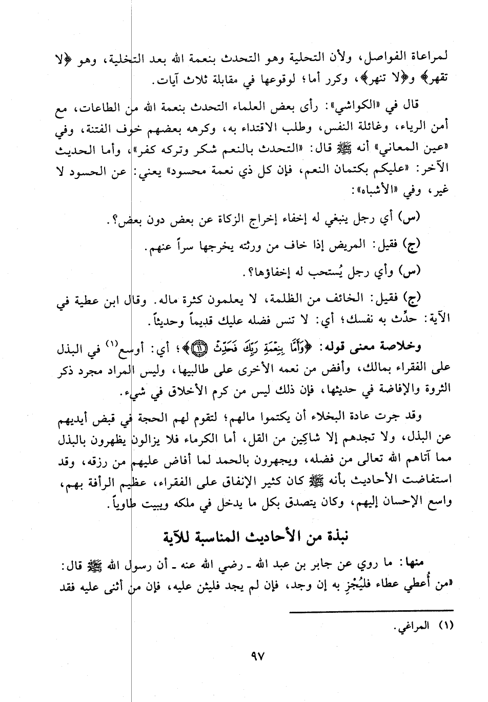 وخلاصة معنى قوله: {وَأَمَّا بِنِعْمَةِ رَبِّكَ فَحَدِّثْ (11)}؛ أي: أوسع (¬1) في البذل على الفقراء بمالك، وأفض من نعمه الأخرى على طالبيها, وليس المراد مجرد ذكر الثروة والإفاضة في حديثها، فإن ذلك ليس من كرم الأخلاق في شىء.