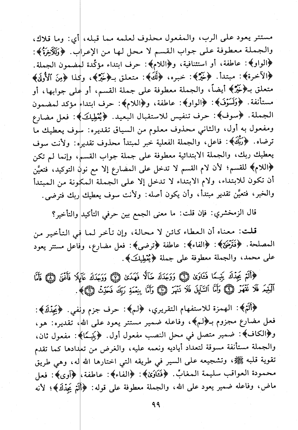مستتر يعود على الرب، والمفعول محذوف لعلمه مما قبله، أي: وما قلاك، والجملة معطوفة على جواب القسم لا محل لها من الإعراب. {وَلَلْآخِرَةُ}: {الواو}: عاطفة، أو استئنافية، و {اللام}: حرف ابتداء مؤكِّدة لمضمون الجملة. {الآخرة}: مبتدأ. {خَيْرٌ}: خبره، {لَكَ}: متعلق بـ {خَيْرٌ}، وكذا {مِنَ الْأُولَى} متعلق بـ {خَيْرٌ} أيضًا، والجملة معطوفة على جملة القسم، أو على جوابها, أو مستأنفة. {وَلَسَوْفَ}: {الواو}: عاطفة، و {اللام}: حرف ابتداء مؤكد لمضمون الجملة. {سوف}: حرف تنفيس للاستقبال البعيد. {يُعْطِيكَ}: فعل مضارع ومفعول به أول، والثاني محذوف معلوم من السياق تقديره: سوف يعطيك ترضاه. {رَبُّكَ}: فاعل، والجملة الفعلية خبر لمبتدأ محذوف تقديره: ولأنت سوف يعطيك ربك، والجملة الابتدائية معطوفة على جملة جواب القسم , وإنما لم تكن {اللام} للقسم؛ لأن لام القسم لا تدخل على المضارع إلا مع نون التوكيد ,فتعيَّن أن تكون للابتداء، ولام الابتداء لا تدخل إلا على الجملة المكونة من المبتدأ والخبر، فتعيَّن تقدير مبتدأ، وأن يكون أصله: ولأنت سوف يعطيك ربك فترضى.