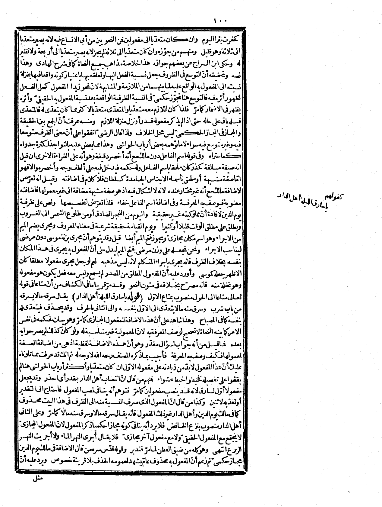 المفعول، لأنها لا تعمل النصب أصلاً، واذا توسع فيه نصب الظرف نصب المفعول به أو إضيف إليه على معنى اللام، ولم يعتد بالإضافة بمعنى في، وأن رفعت مؤنة الإتساع وما يتبعه من الإشكال إمّالأنّ الاتساع محقق في الضمائر المنصوبة لأنها لا تنصب على الظرفية، فحمل على ما هو محقق، وامّا لأنّ في الاتساع قخامة المعنى فكان أولى بالاعتبار ومن أثبتها نظر إلى الظاهر من غير تحقيق، وأهل الدار منصوب بسراق لاعتماد. على حرف النداء كقولك يا ضاربا زيداً ويا طالعا جبلاً، وتحقيقه أنّ النداء يناسب الذات، فاقتضى تقدير موصوف أي يا رجلاَ ضارباً انتهى.