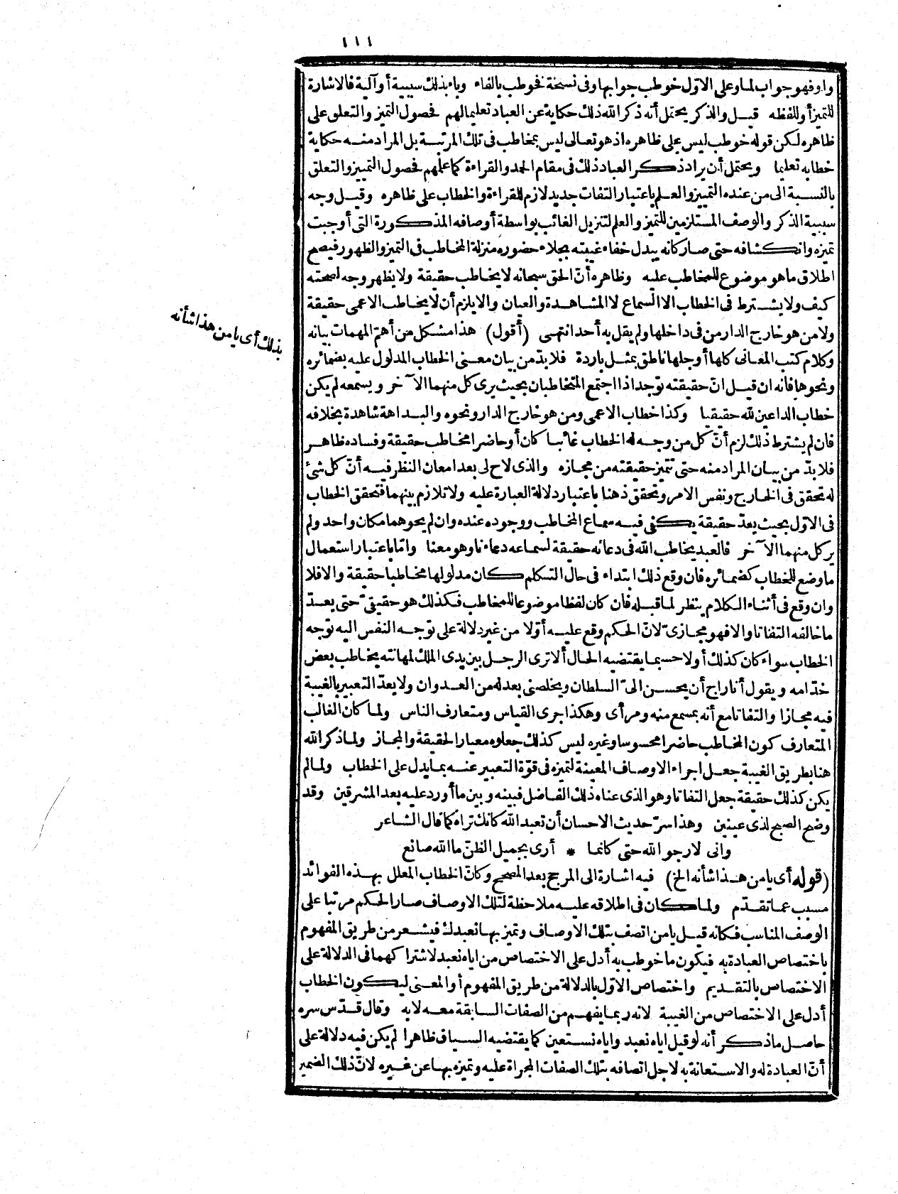ويحتمل الحذف والإيصال، فقول الشارح المحقق: المعنى نخصك بالعبادة أي نجعلك منفرداً بها لا نعبد غيرك وهذا هو الاستعمال العربي ولو قال: نخص العبادة، لكان استعمالاً عرفياً انتهى هو الصواب فلله دره والعجب من المدقق بعدما سمع هذا قال ما قال {فَمَاذَا بَعْدَ الْحَقِّ إِلاَّ الضَّلاَلُ} [يونس: 32] الثاني: القصر هنا حقيقيّ، فلا يتوهم أنه يكون لردّ خطأ المخاطب، ولا مجال له هنا لأنه في القصر الإضافي ومن لم يفرق بينهما فقد سها، وأعجب منه ما قيل إنه اعترض بأنّ المعنى نخص العبادة، وطلب المعونة بك لا نخصك بالعبادة، وكأنه نظر إلى أنهم علموا أنّ ذلك يكون لغير الله أو له ولغيره فقال: نخص العبادة بك قصر قلب على الأوّل، وافراد على الثاني، فوجب حمل كلام المصتف على القلب، وفيه أن ردّ الخطأ في القصر على المخاطب وهو هنا محال، وأجيب بأنه على سبيل التعريض، وهو غير صحيح كما سيأتي، وهو من قصر الفعل على المفعول قلبا لكن النظر في دفع الخطأ لم يندفع انتهى. قوله: (والترقي من البرهان إلى العيان) الترقي في أكثر النسخ بدون لام، ووقع في بعضها وللترقي مصرحا بها كما في بعض الحواشي، فلذا احتمل أن يكون معطوفا على قوله ليكون أو على الاختصاص، أو على أدل وهذا أبعدها، ولما ذكر أوّلأ المصحح للخطاب والالتفات أتبعه بالمرجح له، وهو أنه أدل على الاختصاص به تعالى كما مرّ، وفيه الترقي المذكور مع فوائد ونكات أخر مفصلة في المعاني قيل وكون ما خوطب به أو الخطاب أدل على الترقي، والانتقال محل نظر، فالوجه أن يعطف على مدخول اللام فيكون ين فوائد الخطاب لكن ترتبهما عليه ليس في الوجود الخارجي بل في الوجود العلمي فإن الترقي والانتقال المذكورين متقدمان على الخطاب، وهذا إذا أريد به الحالتان الداعيتان للخطاب، وأمّا إذا أريد بهما الترقي، والانتفال من حيث التعبير بالعبارة الدالة على الحالين فليسا بمتقذمين عليه، والعيان بكسر العين وفتحها خطأ هو مشاهدة العين