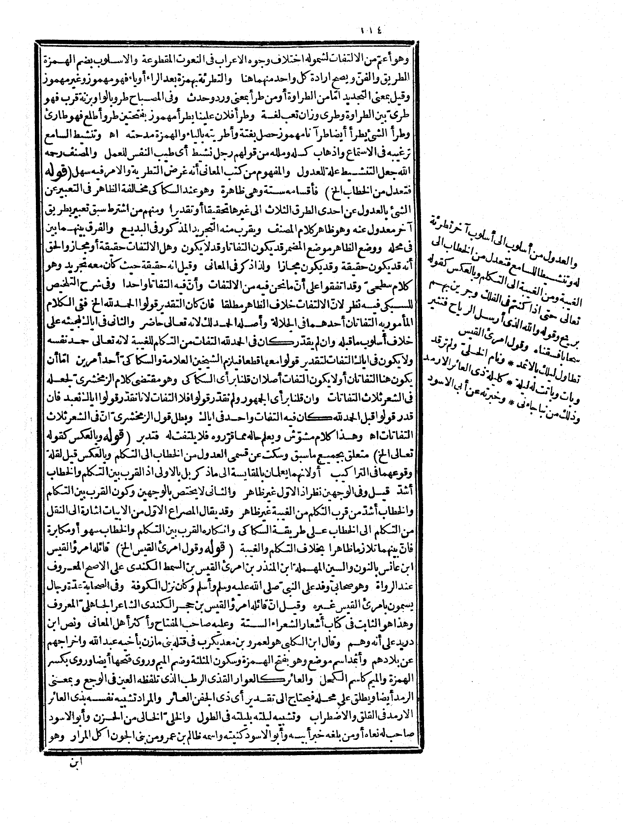 به من المبالغة في الوصف، ومدار الالتفات على اتحاد المعنى ليحصل به ما أريد من إرادة إبراز المعنى في صورة أخرى مغايرة لما يستحقه بحسب الظاهر، فالقول بأنّ أحد أقسام التجريد، وهو مخاطبة الإنسان نفسه التفات مما لا يعتد به، وهذا لم يرتضه بعض الفضلاء وقال فإن قيل مبنى الالتفات على ملاحظة اتحاد المعنى، والافتتنان في التعبير عن معنى واحد