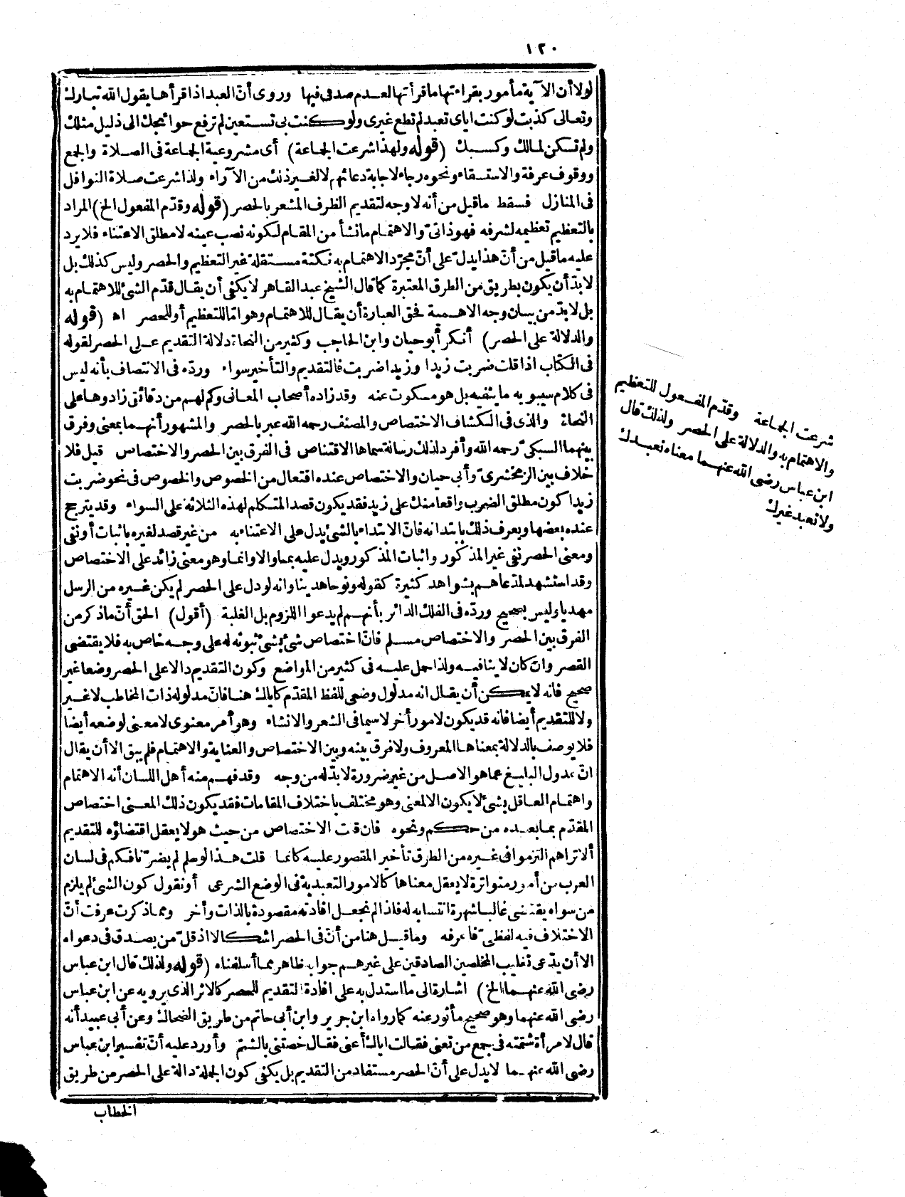 الخطاب فإنه لدلالته على الأوصاف يدل على الحصر كما مرّ، ولا يندفع هذا بأن يقال إنه إسناد له إلى أقوى شيء يمكن استناده إليه وأظهره إذ هذه الدعوى غير ظاهرة، وغير مسلمة عند بعضى النحاة كما بيناه، ولذا قيل: إنه ليس باستدلال بل استثناس له، وتقديم لذلك ليس للحصر بل للاهتمام لكون الدلالة مقصودة، وكون لعلة متقدمة في الوجوه. قوله: (وتقديم ما هو مقدّم في الوجود) وفي نسخة المقدم بالتعريف، والمقدم في الوجود مدلول إياك لأنه القديم الواجب وجوده قبل كل موجود فجعل لفظه موافقا لمعناه وهذا إمّا معطوف على التعظيم أو الدلالة ويجوز أيضا عطفه على الحصر ولكونه خلاف الظاهر لم يذهب إليه أرباب الحواشي مع أنه أورد على ما قبله أنّ التقديم المذكور ليس علة للتقديم حقيقة، وانما العلة كونه ضدّماً في الوجود، أو تقدم ما هو مقدم في الوجود في العبارة وهذا أبعد من نحو ضربته للتأديب، وإن اشتركا في أنّ المعلل والعلة واحد في الحقيقة والعلة في الحقيقة أثر المذكور أي التقدم، والتأدب لنوع اشتراك في المفهوم إلاً أن يقال التقديم هنا بمعنى التقدم على أنه مصدر المبنيّ للمفعول أي لكونه مقذما، أو يؤخر من قدم بمعنى تقدم لوروده في اللغة إذ حصول تقديم ما هو مقذم في الوجود غاية لتقدم المفعول أو يحصل ضمنه كما إذا قدم زيد العالم في مجلس يقال قذم زيد على غيره لتقديم العالم، وقيل أيضاً تقديم ما هو المقدم عليه لتقدم المفعول لا العكس كما يقتضيه التركيب الآ أن يقال: إنه من قبيل ضربته للتأديب لا من قبيل قعدت عن الحرب جبناً، والمعنى قدم المفعول ليتحقق تقا- يم ما هو المقدّم في الوجود فتأمّل. قوله: (بل من حيث " أنها نسبة شريفة إليه) النسبة معناها في اللغة الوصلة بالقرابة فتجوّز بها هنا عن مطلق الوصلة ولذا عطفها المصنف رحمه الله عليها عطفا تفسيريا، فالمراد بها التقرّب إلى الله بطاعته وهو وصلة معنوية، وحقيقة العبادة كما في كتاب النثأتين للراغب فعل اختياري مناف للشهوات البدنية يصدر عن نية يراد بها التقرّب إلى الله طاعة للشريعة، وجعلها نفس النسبة، والوصلة مبالغة في تقريبها إلى الله، فما قيل من أنّ في النسبة هنا استعارة فشبه ما بين العابد والمعبود، بما بين الطرفين من الارتباط تكلف مستغنى عت "، وكذا ما قيل من أنّ التنبيه عليه حصل من هيئة تركب الفعل مع المفعول به. قوله: (فإن العارف إنما يحق وصوله إلخ) العارف عند أهل السلوك من أشهده الله ذاته وأسماءه وصفاته وأفعاله، وأمّا في اللغة والعرف فأشهر من أن يذكر، ويحق بفتح ألياء وضم الحاء وكسرها بصيغة المعلوم بمعنى يثبت، ويتحقق ويقع بلا شك، وفعله لازم أو هو من حق بمعنى أوجب، فالوصرل مفعوله واستغرق بمعنى تمحض
