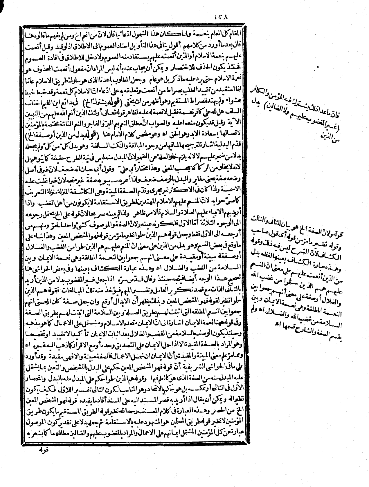 قوله سلموا من الغضب والضلال، ليكون ذات البدل عين ذات المبدل منه، وان اكتفى في اتحادهما ذاتا بمجرد صدق أحدهما على ما صدق عليه الآخر، فلا يخفى أن ما ذكر من الفائدة يتوقف على ما ذكرنا وتعقب هذا بأنه صح عن النبيّ صلى الله عليه وسلم، كما في الدرّ المنثور وغيره أن المغضوب عليهم اليهود والضالين النصارى، فلو كان الموصول عبارة عن مطلق المؤمنين وأبدل منه غير الفريقين كان حسناً بلا محذور وحينئذ يفسر قول المصنف رحمه الله سلموا إلخ بالسلامة عن مثل الغضب والضلال الكائن فيهما، ومنهم من قال في تفسيره: إنه قد سبق أنّ المراد بالموصول المؤمنون، وقيل الأنبياء عليهم الصلاة والسلام وقيل أصحاب موسى وعيسى إلخ فإن كان الأوّل، فالمراد بالمغضوب عليهم والضالين إن كان الذين أريد الانتقام منهم والعادلين عن الطريق السويّ، أو العصاة والجاهلين بالله فالصفة مقيدة إلاً أن يراد المؤمنون إيمانا كاملاَ كما يدل عليه قوله فيما سيأتي لأنّ المنعم عليه من وفق للجمع بين معرفة الحق لذاته والخير للعمل به، وإن كان اليهود والنصارى فمبينة بل مؤكدة وان كان الثاني فمبينة على أي تفسير فسر المغضوب عليهم والضالين، وإن كان الثالث فكالأوّل، ثم إنّ قوله فيما سبق والمراد هو القسم الأخير إلخ يشير إلى وجه آخر، وهو أنّ المراد بالموصول المنعم عليهم بالنعم الأخروية، وما يتوصل به إليها من الدنيوية فإن حمل على المنعم عليه بجميع ذلك فالصفة مبينة، وان حمل على المنعم عليه في الجملة فمقيدة على المعنى الأوّل والثاني للمغضوب عليهم والضالين، ومبينة على المعنى الثالث. قوله: (على معنى أنّ المنعم إلخ) قيل فيما مرّ دلالة على أنّ الإيمان ينافي العصيان. وقوله: (على معنى إلخ) إنما يلائم الابدال والوصف الكاشف لا الوصف المقيد المخصص لأنّ المنعم عليه على هذا التقدير يكون أعمّ، فلا يصح الحمل هو هو إذ لا يقال الحيوان هو الإنسان، فكان عليه أن يؤخر قوله أو مقيدة عن هذا التفسير لثلا يقع الفصل بالأجنبي بين المفسر والمفسر، وهذا مع أنه غير مسلم إنما يرد على غير ما في النسخة الأولى، وقيل إنه إشارة إلى حمل الموصول على المؤمنين والنعمة على الإيمان والمغضوب عليهم والضالين على الأوّل أو الثاني، ويجوز أن