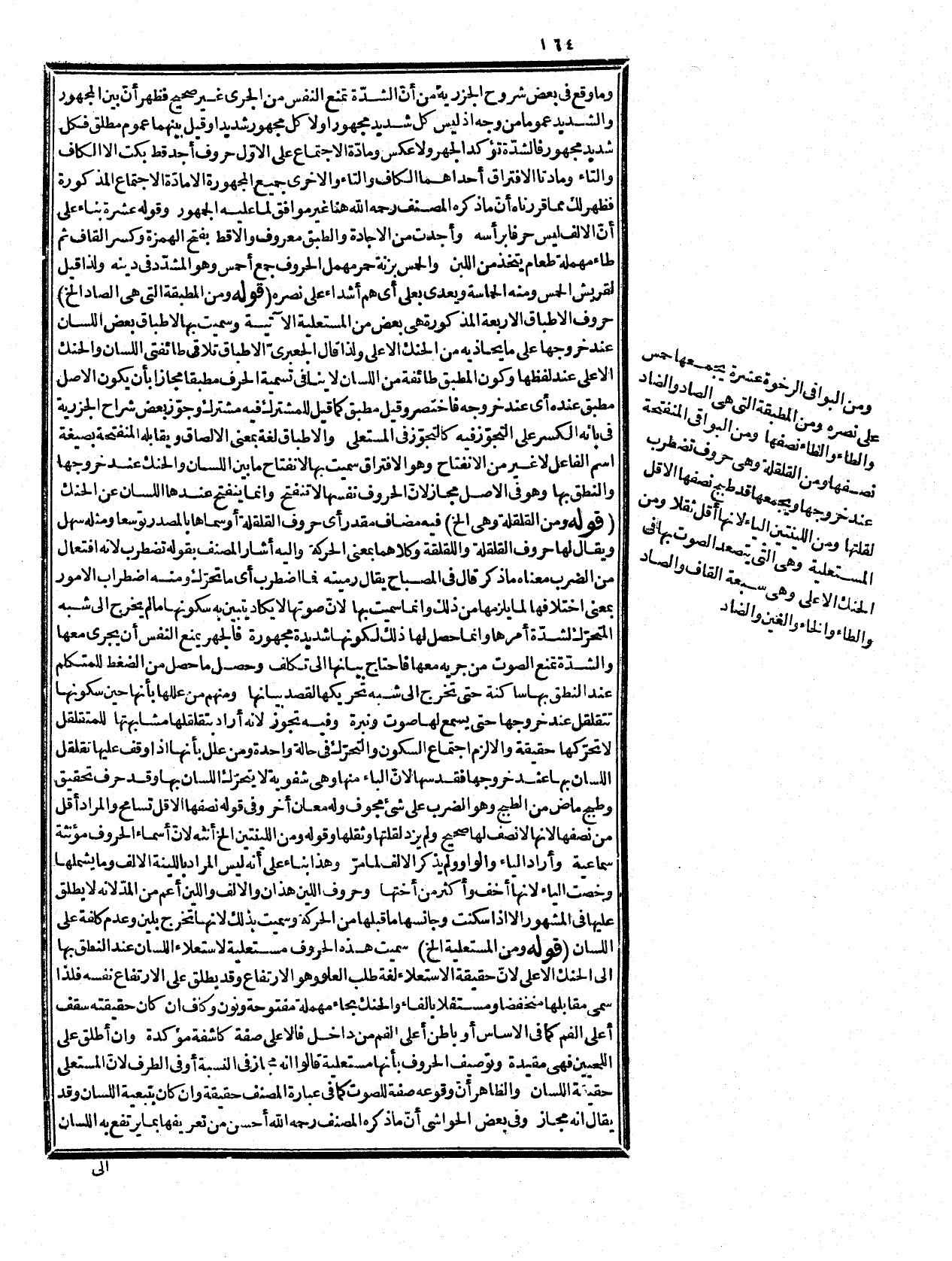 إلى الحنك لما فيه من الاشتباه بالمنطبقة، وليس بشيء لأنهم صرحوا بأنّ الاستعلاء المذكور قد يكون مع انطباق اللسان على الحنك الأعلى، وقد لا يكون فعلى الأوّل يسمى الحرف مستعليا ومطبقاً، وعلى الثاني يسمى مستعليا فقط، فكل مطبق مستعل وليس كل مستعل مطبقا لأنّ الإطباق يستلزم الاستعلاء والاستعلاء لا يستلزم الإطباق، فهذا أعم ولا ضير في صدقه عليه، واسمهما صريح في ذلك، فإن قلت الخاء المعجمة من المستعلية، وهي من الحروف الحلقية، فكيف يقال إنّ اللسان يستعلي بها قلت: هذا مما استشكله بعض القراء.