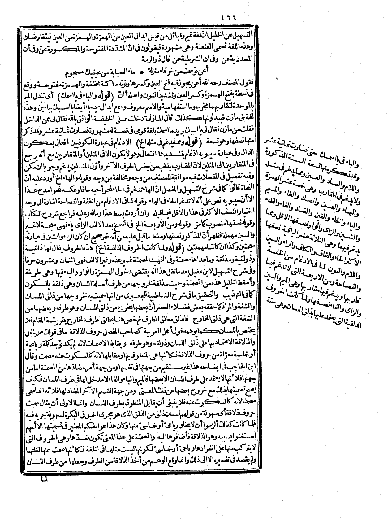 (أقول (ما في المفصل هو بعينه كلام ابن جني في سر الصناعة، وبعيد من مثل هؤلاء الفحول الغفلة كما أورده ابن الحاجب والذي دعاه لما ذكر ما فهمه من اختصاص الذلاقة بطرف اللسان، وقد عرفت أنه لا يختص به، فلا يرد عليه ما ذكر، ولو سلم بناء على أن أئمة اللغة كالأزهريّ والجوهريّ ذكروا ما يقتضيه، فيجاب عما ذكره على فرض تسليمه بأنه غلب فيه طرف اللسان على طرف الشفة مع أنّ في قولهم الاعتماد على طرف اللسان إشارة إلى أنّ المراد أنه آلة للنطق عليها الاعتماد فيه، وهو لا ينافي مشاركة غيره فيه، وقد قال: إنّ الحروف تنسب تارة إلى مخارجها وأخرى إلى ما يجاورها، والأوّل كحرف حلقيّ والثاني كهوائيّ، وقريب منه ما قيل: إنه أراد بالاعتماد على ذلق اللسان الاعتماد عليه حقيقة أو حكما، فإنّ الشفويّ، والمعتمد عليه متقاربان ولتقاربهما سميا ذولقية، ومر أمر منه، والنفل من الغنيمة معروف ومن يعطاه منفل وكثر الحلقية والذولقية معروفة بالاستقراء وصريح أئمة اللغة، ولذا قالوا إنه لا يخلو من الذولقية كلمة رباعية أو خماسية إلا أن تكون معرّبة أو دخيلة او شاذة أو فيها ما يقرب منها فيسد مسدها كالعسجد بمعنى الذهب والدهدقة بدالين منهملتين مفتوحتين وهاء وقاف بمعنى الكسر كما قاله الجاربردي، والزهزقة بزاءين معجمتين بمعنى شدة الضحك، والعسطوس بفتح العين والسين المهملتين اسم لشجر، ولكثرتها ذكر ثلثاها ومن مقابلها أقل من نصفها (بقي هنا بحث) وهو أنّ ما قرّرناه متفق عليه في كتب العربية والقراءات إلا أنه يخالفه ما في الكشاف في سورة التكوير من قوله: إنّ الظاء المعجمة من طرف اللسان وأصول الثنايا العليا وهي أحد الأحرف الذولقية أخت الذال والثاء اهـ فجعله الظاء ثمة بل وأختيها ذولقية ينافي ما تقرّر هنا، وقول أهل العربية والأداء أن مخرج هذه الثلاثة من طرف اللسان وأصول الثنايا العليا ويقال: لها الثوية نسبة للثة وهي اللحم النابت حول الأسنان لمجاورتها إياها لا أنها مخرج كما قيل يقتفخيه أيضا، فإذا كانت من طرف اللسان كما يشهد به الحس، فكيف لا تكون ذولقية كما قاله العلامة في سورة التكوير، وما وجه تركهم لذكرها، وقول المدقق في الكشف كون الظاء ذولقية مخالف لما في المفصل وغيره، وأمّا الاشتقاق من ذلق اللسان وذولقه أي حده فلا يخالف ما في الكشاف أيضا إلخ يشير لما ذكرناه أيضا فتدبر. قوله: (ذكر ثلثيها إلخ) هو جواب لما، وهو من كل منهما أربعة كما لا يخفى. وقوله: (ولما كانت أبنية المزيد إلخ (قال في التسهيل: بعدما قسم الكلم المتمكنة إلى مجرّد، ومزيد فيه ولا يتجاوز المجرد خمسة أحرف إن كان اسما، ولا أربعة إن كان فعلاً ولا ينقصان عن ثلاثة والمزيد فيه إن كان اسما لم يتجاوز سبعة إلا بهاء التأنيث، أو زيادتي التثنية، أو التصحيح أو النسب، وان كان فعلاَ لم يتجاوز ستة إلا بحرف التنفيس، أو تاء التأنيث، أو نون التوكيد اهـ وفي شرحه لأبي حيان أنه باعتبار المشهور الأكثر إذ قد ورد من الاسم المزيد ما هو ثماني نحو كذبذبان بتشديد الذال الأولى، ووزنه فعلعلان مع ألفاظ أخر ذكرها فقوله: لا تتجاوز عن السباعية هنا باعتبار الأغلب