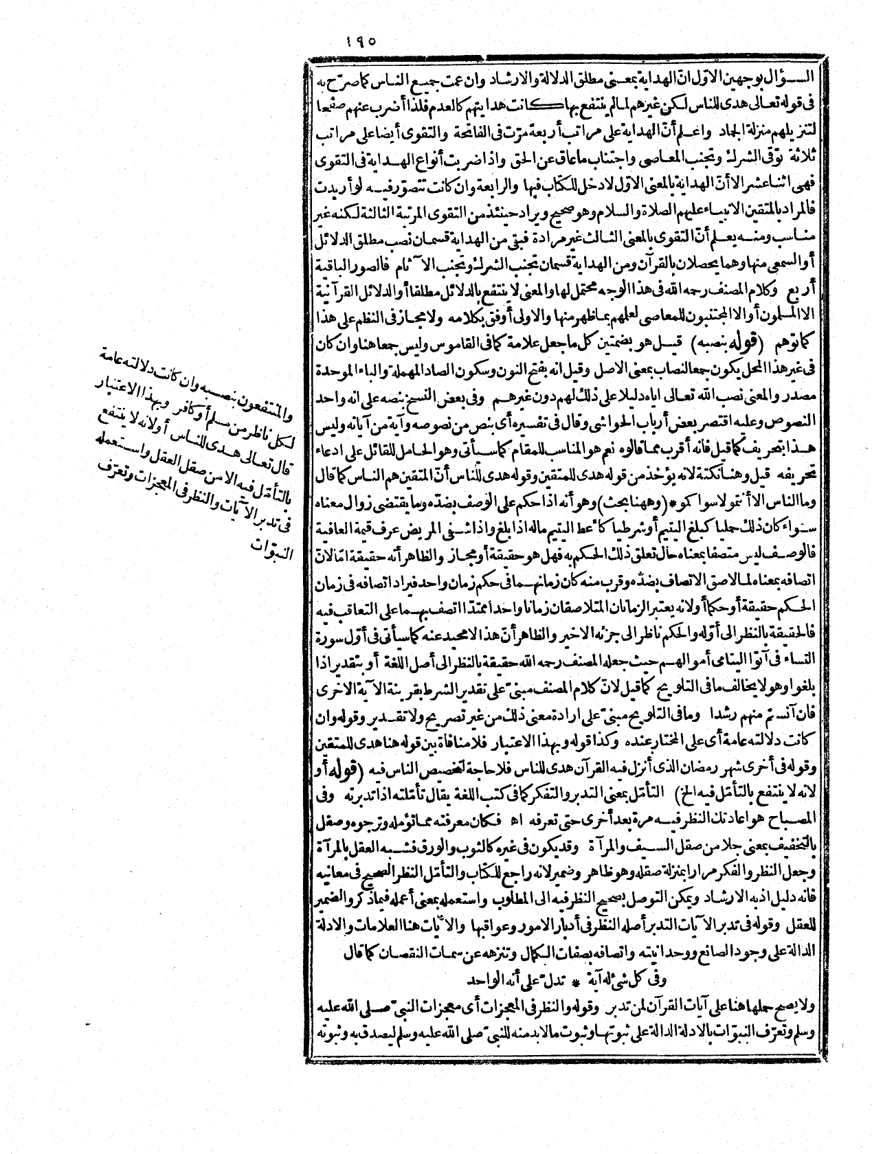 بالأدلة العقلية المثبتة لها وقد أجاب المصنف رحمه الله عما أورد على تخصيص الهدى بالمتقين بوجهين استصعب الناظرون فيه الفرق بينهما حتى قيل: إنّ هذا الجواب الثاني هو الأوّل بعينه لأنّ معنى صقل العقل صونه عن طوارق الثبه، وصد الآراء الفاسدة، وتجريده عن انتقاش الصور الباطلة الشاغلة له عن ارتسام الصور الحقة، وهو عين التقوى فلا يحسن عطفه عليه بأو، إلا أن يقال هذا بحسب التقوى في القوّة النظرية، والأوّل بحسبها في القوّة العقلية، فعطف بأو نظرا للقوّتين، وقريب منه ما قيل حاصل الأوّل اختصاصهم بهداه بسبب اختصاصهم بالعمل به، والثاني بحسب معرفة معانيه وإسراره لأنّ غير المتقي لا يصقل عقله باستعماله في تدبر آياته المفضي إلى المعرفة (وقد أعملت بريد النظر هنا) ووقفت على ما في الحواشي، فرأيته دائرا بين أمرين الخطأ في فهم كلام المصنف، كالذي ذكر آنفا والتدليس بالإجمال الغير المفيد مثل ما قيل: إن الفرق بين الوجهين أنّ محصل الأوّل إنّ دلالة الكتاب، وان عمت المتقي وغيره والمسلم والكافر إلا أنّ دلالته نزلت منزلة العدم بالنسبة لمن لم ينتفع بها، والثاني أنّ دلالته عامّة لكل ناظر وإنما يكون حجة بالنسبة للمسلم المصدق بوحدانية الباري وصفاته، وبالرسالة وحقوقها، وهذا إنما يكون لمن صقل عقله عما يمنعه عن الوصول للحق، واستعمله في التفكر فيه وفي دلائله، فلا يكون هدى إلا للمتقي عن الكفر وما يؤدّي إليه (وإن أردت تحقيق هذا المقام) فاعلم أنّ المصنف رحمه الله اقتدى بالإمام حيث قال القرآن كما هو هُدًى لِّلْمُتَّقِينَ ودلالة لهم على وجود الصانع وعلى دينه وعلى صدق رسوله صلّى الله عليه وسلّم فهو أيضا دلالة للكافرين إلا أنه تعالى ذكر المتقين مدحا ليبين أنهم الذين اهتدوا وانتفعوا به كما قال: {إِنَّمَا أَنتَ مُنذِرُ مَن يَخْشَاهَا} [النازعات: 45] مع عموم إنذاره ومن فسر الهداية بالدلالة الموصلة فالسؤال زائل عته لأنّ
