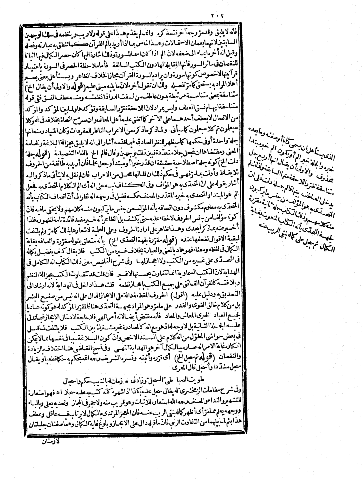 قوله تعالى: {فَسَجَدَ الْمَلآئِكَةُ كُلُّهُمْ أَجْمَعُونَ} [الحجر: 30] مع اتحاد كلهم وأجمعون في التأكيد به للملائكة، وليس الاستحسان بحسن فإنّ التأكيد إذا تعدد سواء كان من نوع أو لا لا يصح عطفه إذ لم يسمع، ولم يقل به أحد من النحاة ثم إنه قيل عليه أنه يقتضي أن يكون من أسباب الفصل كون الثانية مؤكدة لما أكد بالجملة الأولى، ولو قيل أنه لم يعطف على لا ريب فيه لئلا يتوهم عطفه على ذلك الكتاب جاز، وهو أحسن مما ذكره السيد وأقرب ولا يلزمه اختراع سبب آخر للفصل، ثم إنه قيل إنّ سبب عدول صاحب المفتاح عما في الكشاف أنه لا يجوز أن يكون للتأكيد تأكيد في المفرد المقيس عليه، وان ترك العطف فيما اختاره لأنّ بين اللفظي والمعنوي مباينة تقتضي الفصل، وأنه لا يصح العطف على أمر هو من تتمة أمر آخر، ولا يخفى أنه يرد عليه أنه مخالف لذلك أيضاً في الجملة الأولى، وفي تقديم التأكيد المعنوي على اللفظي، والمعروف خلافه، وقد وجه بما تركه أحسن من ذكره، فالحق أنّ ما ينزل منزلة الشيء لا يلزم أن يكون مثله من جميع الوجوه وما استصعبوه أهون من أن يستصعب فافهم ترشد. قوله: (أو تستتبع كل واحدة إلخ) هذا معطوف على قوله تقرّر اللاحقة منها السابقة. وقوله: (استتباع) بالنصب مفعول مطلق وعامله تستتبع، وهو إمّا نوعي أو تشبيهي كخبط خبط عشواء لأنّ الاستتباع طلب التبعية، والمراد به الاستلزام، وهو على ضروب منها استلزام الدليل لمدلوله أو المراد ما يقرب منه، ويشبهه لما بينهما من التلازم لاستلزام الإعجاز غاية الكمال، وغاية كمال الكلام البليغ ببعده من الريب والشبه لظهور حقيقته، وذلك مقتض لهدايته، وإرشاده فإن نظر إلى اتحاد المعاني بحسب المآل كان الثاني مقرّرا للأوّل، فيترك عطفه وهو الوجه الأوّل، وان نظر لأنّ الأوّل مقتض لما بعده للزومه له بعد التأمّل الصادق، فالأوّل لاستلزامه لما يليه، وكونه في قوّته بجعله منزلاً منه منزلة
