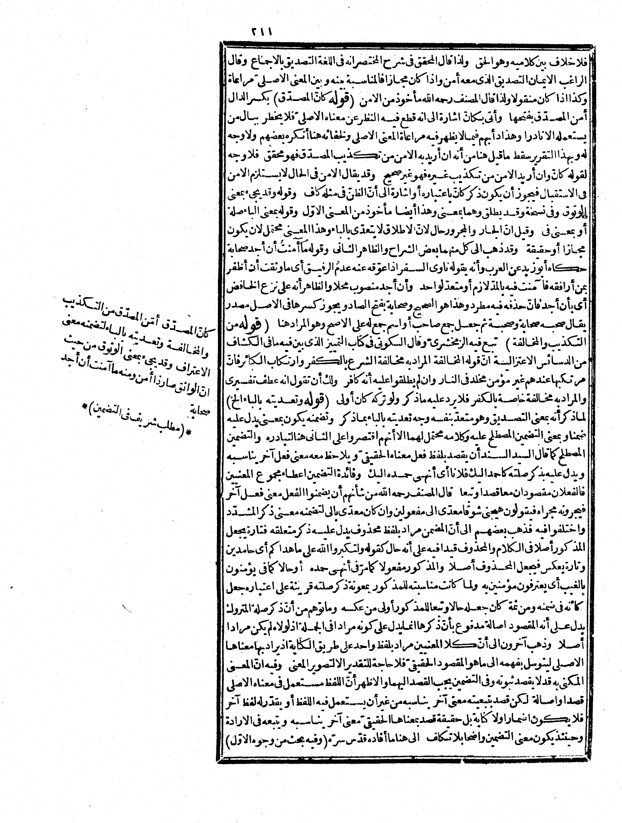 (الرابع) أنّ ما ارتضاه مبنيّ على أنّ اللفظ قد يدل على معنى دلالة صحيحة بغير الطرق الثلاثة الحقيقة والمجاز والكناية، وفيه ما لا يخفى من أنّ مستتبعات التراكيب لا يمكن إنكارها، فإنها الشمس في وسط النهار إنما النظر في كونها مقصودة منه بدون الطرق الثلاث، وكونها عاملة في المتعلقات مما لا يعهد مثله في بليغ الكلام، فإن قلت كيف يكون مضمنا معنى الاعتراف، وقلما يوجد في الكلام آمنت الله بل لم يسمع أصلاً للزوم الباء فيه، وقد قال نجم الأئمة الرضى أنه إذا كان الغالب في فعل التعدية بحرف فهو لازم متعد بالحرف وأيضاً اعتبار الاعتراف يشعر بلزوم الإقرار باللسان في الإيمان شرعا على ما سيأتي بيانه فيه قلت: هذا ما أورد. بعض الفضلاء، ولم يجب عنه ولا يخفى اندفاعه فإنه مجاز وقد أجازوا فيه أن يلتؤم، وتهجر الحقيقة فأيّ مانع هنا مما ذكر خصوصاً واللزوم إنما نشأ من نقله شرعا إلى هذا المعنى