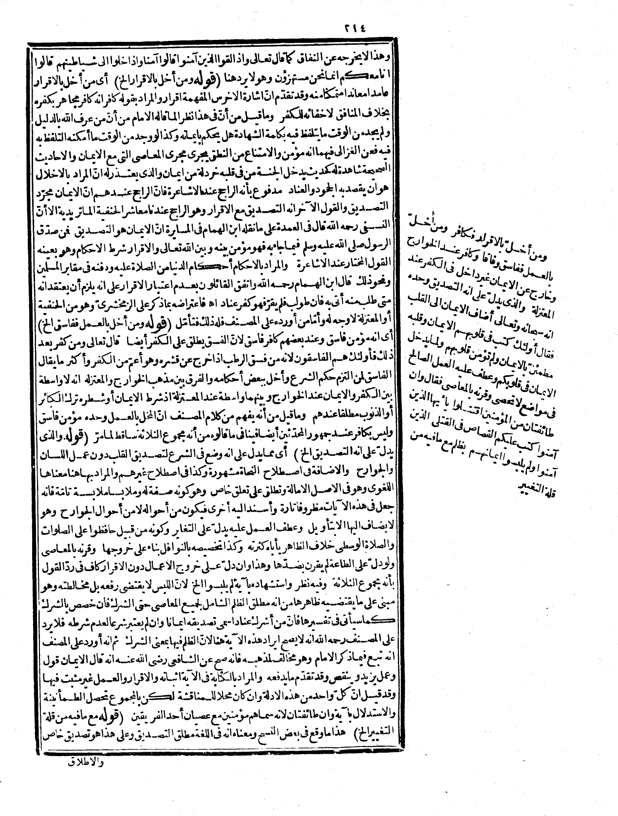 والإطلاق والتقييد تفاوت ما بينهما قليل، وهو المعروف في المنقولات بخلاف قولهم إذ فيه مع التغيير زيادة الإقرار والعمل، وليس معنى هذه العبارة ما قيل: من أنّ المراد بالتصديق الاعتقاد الجازم المطابق للواقع، وهو قلما يقبل التغيير بتشكيك مشكك يخلاف القول والعمل لأنه متغير، وغير دائم فإنه تكلف وعدول عن جادّة الطريق. وقوله: (وإنه إلخ) المراد بالأصل المعنى اللغوي المنقول عنه وفي بعض النسخ فإنه بالفاء على أنه تعليل لما قبله، قيل سر هذا الاختلاف، وترجيح ما ذكر راجع إلى أن المكلف الروج فقط والبدن آلة لها ومركب أو البدن أو مجموعهما، فإن قلنا بالأوّل وهو الأظهر فهو التصديق وان قلنا بغيره يعتبر عمل اللسان والجوارج. قوله:) وهو متعين الإرادة إلخ) الظاهر أن هذه جملة حالية والواو واو الحال لا عاطفة على ما قبله، كما قيل لما فيه من التعسف وكذا