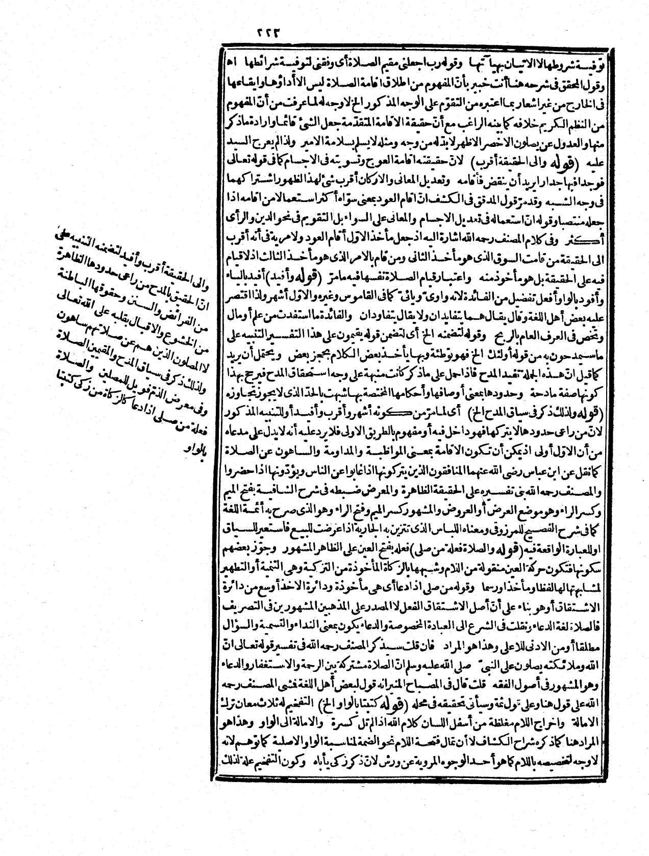 وقال الفاضلان في شرحه إنه يريد أنّ صلى ماخوذ من الصلا بمعنى حرك الصلوين وهما العظمان الناتئان في أعالي الفخذين يقال: ضرب الفرس صلويه بذنبه أي ما عن يمينه وشماله ثم استعمل صلى بمعنى فعل الهيئات المخصوصة مجازا لغوياً لأنّ المصلي يحرّك صلويه في ركوعه وسجود.، ولما اشتهر في هذا المعنى استعير منه لمعنى دعا تشبيهاً للداعي بالمصلي في خضوعه وتخشعه وفيه ضعف من وجهين. الأوّل إنّ الاشتقاق مما ليس بحدث قليل الثاني أنّ الصلاة بمعنى الدعاء شائعة في أشعار الجاهلية، ولم يرد عنهم إطلاقها على ذات الأركان بل ما كانوا يعرفونها، فأنى يتصوّر لهم التجوّز عنها فالصواب ما ذهب إليه الجمهور من أنّ لفظ الصلاة حقيقة في الدعاء مجاز لغويّ في الهيئات المخصوصة المشتملة عليها كما حقق في أصول الفقه، فإن قيل إذا ثبت صلى بمعنى حرّك الصلوين كان الأنسب أن يؤخذ منه لفظ الصلاة بمعنى الهيئة المخصوصة، ثم يشتق منه صلى بمعنى أحدثها، فلماذا عكس المصنف رحمه الله قلنا: لأنّ المناسبة بين تحريك العضو وإحداث الهيئة أقوى منها بين تحريكه ونفس الهيئة، ولذلك أيضاً جعل الزكاة من زكى الشرعي المأخوذ من زكى اللغوي على أنّ قوله الصلاة من صلى قد يراد به أنها من جنسه أي يتلاقيان في الاشتقاق بلا تعيين للمشتق منه فجاز أن يحمل على اشتقاق صلى من الصلاة، وكذا الحال في الزكاة، وأورد عليه في الكشف أيضاً أنه مخالف لمذهب المعتزلة فإنها عندهم حقائق مخترعة شرعية وليست منقولة من معان لغوية، والقائلون بالنقل، وهم الجمهور قالوا: إنها منقولة من الدعاء، وفي الروض الأنف: الصلاة أصلها انحناء وانعطاف من الصلوين وهما عرقان في الظهر إلى الفخذين، ثم قالوا: صلى عليه أي انحنى عليه رحمة وسمواً الرحمة حنوّا وصلاة وعطفاً وأصله في المحسوسات فجعل في المعاني مبالغة وتأكيدا، ولذلك لا تكون الصلاة بمعنى الدعاء على الإطلاق، فلا تقول صليت على العدوّ أي دعوت عليه إنما يقال صليت عليه في الرحمة والتعطف لأنها في الأصل الإنعطاف، ولذا عديت بعلى، ولا تقول في الدعاء إلا دعوت له باللام فهذا فرق مّا بين الصلاة والدعاء، وأهل اللغة لم يفرقوا بينهما.