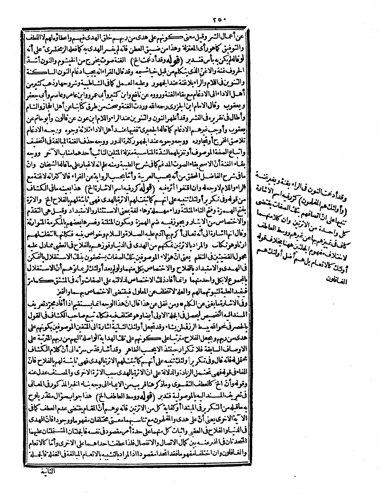 نحو هو عارف قلت: المراد الأخير لتطابق الوجوه في إفادة الحصر، ولا حاجة لما ذكره لما تقدّم من أنّ أولئك في معنى الصفة المشتقة، ومثله يفيد علية مبدأ الاشتقاق ويفيد الحصر. قوله: (والمفلح بالحاء والجيم إلخ) هذا بناء على ما عليه قدماء أهل اللغة من أنّ المشاركة في أكثر الحروف اشتقاق يدور عليه معنى المادّة، فيتحد أصل معناها ويتغاير من بعض الوجوه كما يعرفه من طالع التهذيب والعين ونحوهما من كتب اللغة القديمة، ولذا اعتبروا ني الترتيب الأوّل، وما يليه ولم ينظروا إلى الأخير كما فعله الجوهريّ، والمراد بقوله بالحاء والجيم تفسير اللفظ من حيت اللغة وإلا فالقراءة بالحاء المهملة لا غير ولم يقرأ بالجيم في شيء من الشواذ والفلح بالحاء بمعنى الشق والفتح، وكذا الفلج بالجيم أيضاً كما في كتب اللغة، والظاهر أنهما معنيان فإنّ الشق قد يقع من غير فرجة والفتح قد يكون بغير شق كفتح الباب والكتاب، فبينهما عموم وخصوص وجهي وقوله الفائز بالمطلوب هذا هو المعنى العرفي المعروف في الاستعمال والشق والفتح معناه الحقيقي الأصلي. وقوله: (كأنه إلخ) بيان للملابسة والمناسبة بينهما واكتفى بذكر الفتح فيه لاشتماله على الشق في الغالب فلا يقال المناسب لما بعده أن يذكره، لكنه لو صرّح به كان أحسن والوجوه جمع وجه، ومعناه النوع أو الطريق
