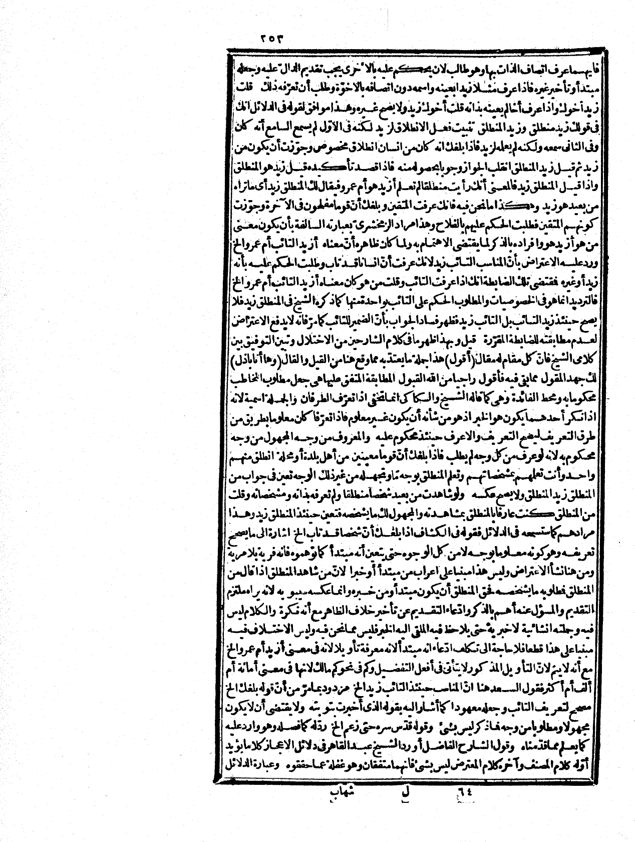يشخصه، فحق المنطلق أن يكون مبتدأ ومن خبره، وأنما عكسه سيبوبه لأنه يراه ملتزم التقديم، والمسؤول عنه أهم بالذكر وادّعاء التقديم عن تأخير خلاف الظاهر مع أنه فكرة، والكلام ليس فيه وجملته إنشائية لا خبرية حتى يلاحظ فيه الملقى إليه الخبر، فليس مما نحن فيه، وليس الاختلاف فيه مبنيا على هذا قطعاً، فلا حاجة إلى تكلف ادّعاء أنه مبتدا لأنه معرفة تأويلاَ لأنه في معنى أزيد أم عمرو إلخ مع أنه لا يتم لأنّ التأويل المذكور لا يتأتى في أفعل التفضيل، وكم في نحوكم مالك لأنها في معنى أمائة أم ألف أم أكثر، فقول السعد هنا إنّ المناسب حينثذ التائب زيد إلخ مردود بما مرّ من أنّ قوله بلغك إلخ مصحح لتعريف التائب، وجعله معهودا كما أشار إليه بقوله الذي أخبرت بتوبته، ولا يقتضي أن لا يكون مجهولاً ومطلوبا من وجه، فما ذكر ليس بشيء، وقوله قدس سرّه: حتى زعم إلخ ردّ له كما فصله وهو وارد عليه كما يعلم مما قدمناه، وقول الشارح الفاضل: أورد الشيخ عبد القاهر في دلائل الإعجاز كلاما يؤيد أوّله كلام المصنف، وآخره كلام المعترض ليس بشيء، فإنهما متفقان وهو غفلة عما حققوه، وعبارة الدلائل إنك في قولك زبد منطلق وزيد المنطلق تثبت فعل الانطلاق لزيد لكنك تثبت في الأوّل فعلاً لم يسمع السامع من أصله أنه كان وفي الثاني فعلاً قد علم السامع أنه كان، ولكن لم يعلمه لزيد فإذا بلغك أنه كان من إنسان انطلاق مخصوص وجوّزت أن يكون ذلك من زيد، ثم فيل لك زيد المنطلق انقلب ذلك الجواز وجوابا وزال الشك، وحصل القطع بأنه كان من زيد اهـ. يعني أنّ المخاطب لما علم زيداً بمشخصاته وبلغه أنّ إنسانا انطلق كان المنطلق حاضرا في ذهنه فيصح أن يعرف بالتعريف العهدي، ولكنه لما لم يتعين كان مطلوبا لتردده فيه فتعين جعله خبراً، لكونه هو المجهول عنده من وجه بخلاف الصورة الآتية، وهذا بعينه ما في الكشاف، إلا أنّ المعتر ضومن سلم اعتراضه لم يهتد لتطبيقه، ثم قال الشيخ: وإذا قيل: المنطلق زيد فالمعنى على أنك رأيت إنسانا منطلقا بالبعد منك، فلم يثبت ولم تعلم أزيد هو أم عمرو فقال: لك صاحبك المنطلق زيد أي هذا الشخصى الذي تراه من بعد هو زيد، وقد تشاهد لابس ديباج وقد كنت تعرفه فنسيته، فيقال لك اللابس الديباج صاحبك الذي كان معك في وقت كذا، فيكون الغرض إثبات أنه ذلك الشخص المعهود لا إثبات لبس الديباج لأنه شاهده يعني أنك لما شاهدت انطلاقه ولبسه الديباج كان اللابس والمنطلق محسوسا عندك لا تردّد فيه، ولا تطلبه وإنما تطلب تشخيصه، وتعيينه فتعين جعله مبتدأ وزيدا خبراً بخلاف ما مرّ من عكسه لأنّ زيدا محسور أو بمنزلته، والمنطلق لم تعرفه إلا بأنّ ثمة شخصاً صدر منه انطلاق، فأنت لم تشاهده ولم يعينه المخبر عندك، فلذا جعل خبرا فقد وافق أوّل كلامه آخره من غير شبهة، وهو بعينه ما في الكشاف فقد انكشف لك المراد بما لا مزيد عليه، وتبين أنّ ما ارتضاه الشريف المرتضى، وادّعى أنه لا يتزلزل فيه من له رسوخ قدم في علم المعاني غنيّ عن البيان الهادم لما أسسه من البنيان لما عرفت من أنّ المراد أنك شاهدت شخصا منطلقا، ولم