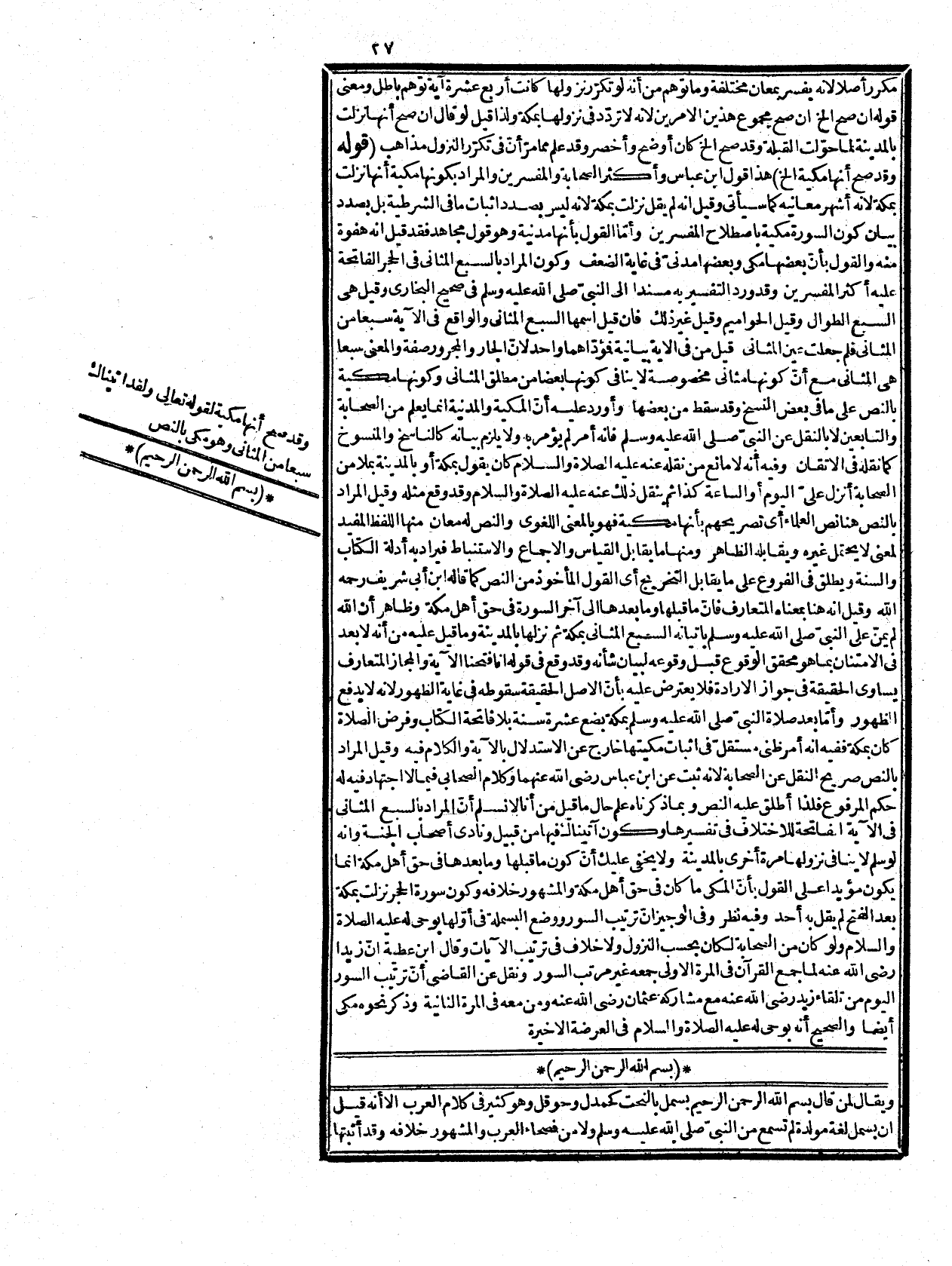 النص، وسبب الظن أمر بالإسرار بها، وقال الكرخي: لا أعرف هذا المسألة بعينها لمتقدمي أصحابنا إلا أن أمرهم باخفائها يدل على أنها ليست من السورة، وقيل: إنه لم ينص فيها بشيء ظن أنه أبقاها على أصلها من العدم حتى يظهر الثبوت وقيل: ظن في هذه العبارة ليس فعلاَ مجهولاً بل مصدر منوّن مرفوع لأنه خبر أنّ مقدم والمراد تزييف نسبته إليه، والردّ على الزمخشري في قوله: إنه مذهب أبي حنيفة تلميحاً لقوله تعالى: {إِنَّ بَعْضَ الظَّنِّ إِثْمٌ} (قلت) وهو من بعض الظن أيضا. وما في الكشاف: إن لم نقل أنه ظفر برواية عنه بناء على إطلاق مذهب أبي حنيفة على ما يشمل كلام أصحابه كما هو المتداول بينهم. فمان قلت: كيف يصح القول بأنها ليست منها وأن أبا حنيفة لم ينص فيها بشيء مع أنّ محمد بن القاسم، والبرهان الكافي وغيرهما نقلوا عن أبي حنيفة رحمه الله تعالى إيجابها في الصلاة، حتى قال الزيلعي رحمه الله: يجب سجود السهو بتركها، ونقل عن المجتبى وجوبها في كل ركعة قلت: قال أستاذي المقدسي في كتاب الرمز عن شرح المختار لشيخه السمديسي: إنها ليست بواجبة فقد حكى المحققون كالإمام أبي بكر الرازي والكاشافي وغيرهما أن الخلاف في السنية لا في الوجوب، وقال بعض المحققين: القول بوجوب البسماة ليس له أصل في الرواية وما نسب إلى أبي حنيفة من الخلاف في الوجوب من طغيان اليراع، وكذا ما ذكره الزيلعي ويلزم مما ذكر أنها ليست آية من غيرها أيضاً إذ لا قائل بأنها آية من غير الفاتحة فقط قوله: (وسئل محمد الخ) الدف والدفة بفتح الدال المهملة وتشديد الفاء الجنب من كل شيء، ودفتا المصحف جانبا جلده المتضمن له ونحوه وهو أيضاً لم ينص على نفي، وإثبات تأدّيا وان كان المراد قرآنيتها، والمراد المصاحف العثمانية القديمة المتداولة، فلا يرد كتابة القنوت في مصحف ابن مسعود رضي الله عنه. فإدط قلت: ما بين دفتي المصحف صور الألفاظ ونقوشها وكلام الله إمّا لفظيّ أو نفسيّ فما وجه إطلاقه عليها.